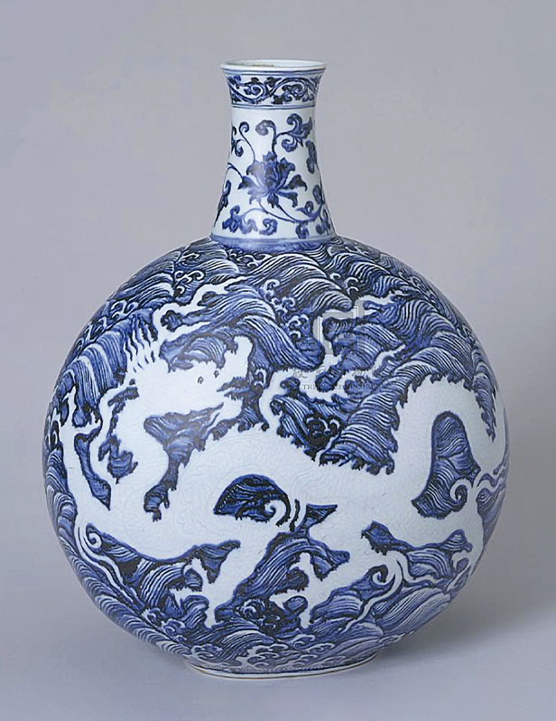 盘心留白而成的白龙纹样于明初青花器中十分罕见,并多为袭宋元遗风的三爪龙形。采用此种技法者,所见均为御窑重器,以天球瓶最为知名,北京故宫博物院、大英博物馆大维德基金会、伊朗国家博物馆、日本出光美术馆等均有收藏,此外还有梅瓶、大碗等造型。叶喆民先生对这一品种的艺术表现力的评价颇为中的,“用浓重深厚的青色海水衬托出一条矫健飞舞的白龙,使人感到仿佛它置身于波浪滔天、汹涌澎湃的大海中,腾云驾雾,气势凶猛。尤其是深蓝的海水与洁白的龙身形成鲜明的对比,充满了动力美,充分表现了匠师们不同凡响的艺术才能。”