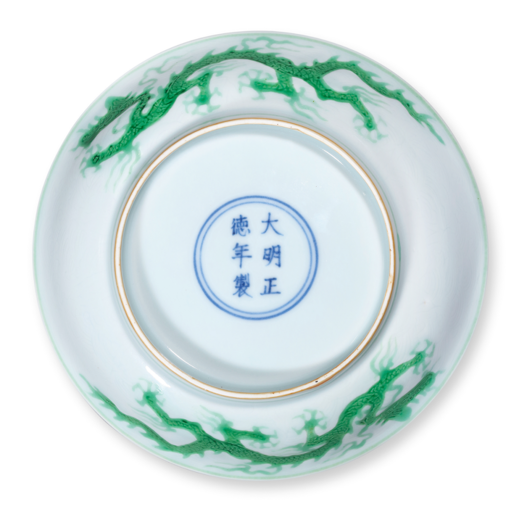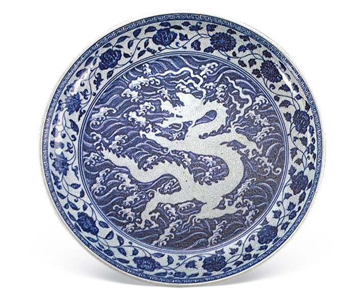 本件欧洲秘藏近百年的永乐御窑神品——“明永乐青花留白暗刻龙纹海浪大盘”,为丹麦著名建筑家所罗门·塞伦森(1856-1937)旧藏,这也是这一重器重回故国的首次亮相。本件大盘形制规整,大口微敛,弧腹广底,浅圈足,为明初大体量盘式的经典造型。通体青花描绘纹饰,内壁绘牵连缠绕的缠枝花卉十二朵;外壁绘奔龙四条,其间以壬字云纹间隔。盘心青花双圈内绘奔涌的海涛为地,再以留白技法浅刻须爪鳞片表现一半侧面立龙,仅双目龙睛以青花点绘,身旁围绕的火焰亦以留白技法表现,在青花海水地子的波涛衬托下,使得龙跃于渊,极具神韵。