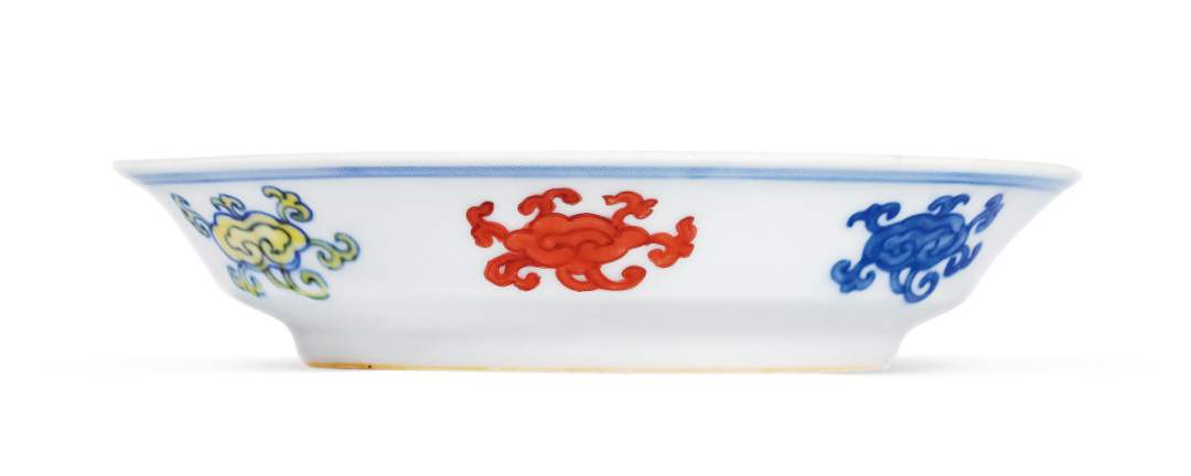 此式斗彩灵芝折腰盘系由成化官窑器演化而成,逐为帝王御赏之极简清雅之器。此碟胎体极薄,几至脱胎,青花发色浅淡,屡中透紫,恬静淡雅。其成化原型,可参见台北故宫博物院藏例,录于《成化瓷器特展图录》,台北故宫博物院,2003年,页179,图187。与北京故宫博物院藏例,录于《故宫博物院藏文物珍品大系-青花釉里红》(中),上海科学技术出版社、商务印书馆(香港),2000年,页21,图19。