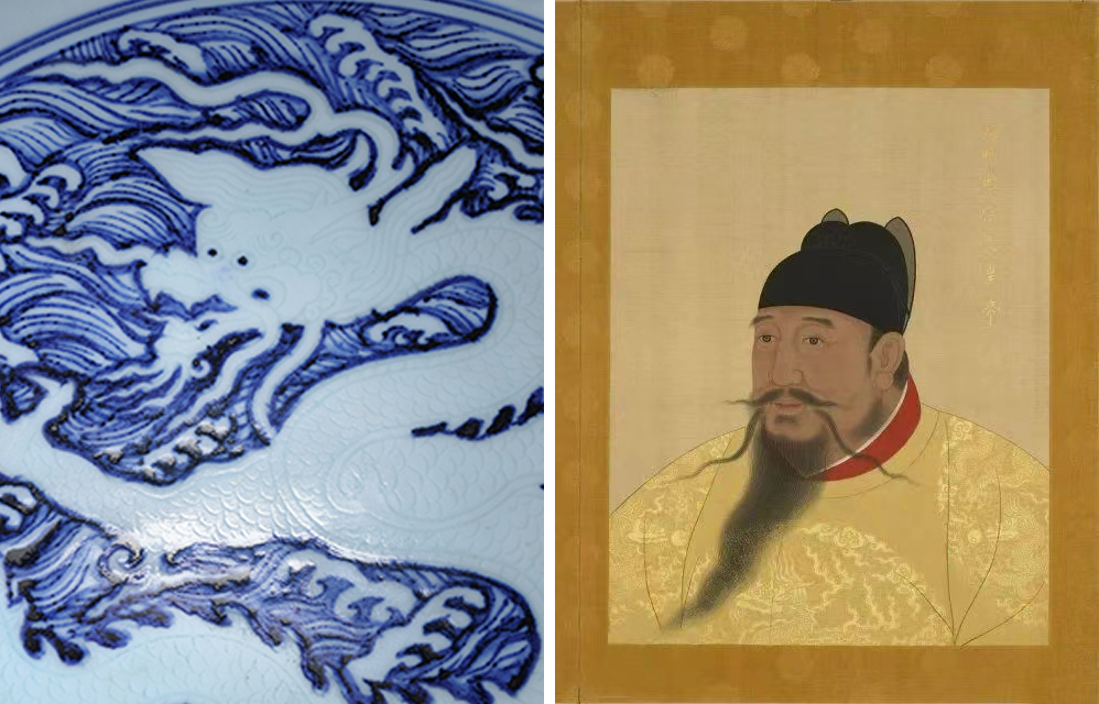 联想到朱棣本人由燕王之封发动“靖难”直至登基改号永乐,无论是正史还是戏说,描述中都充满了戏剧性的情节,以姚广孝一句“臣奉白帽著王”(暗示“王”将为“皇”)用为谋士,对相士袁珙加以重任,永乐对相术的态度,可以说是实打实的信奉了。永乐在为父皇太祖朱元璋所作“大明孝陵神功圣德碑”对中对父亲相貌的描述为“龙髯长郁,然项上奇骨隐起至顶,威仪天表,望之如神”,俨然一副“异人”模样,而这正是相术之中的“帝王之相”,朱棣为了证明自己皇权的正统,自己必然也要有“龙形虬髯”的“帝王之相”。何为“龙形虬髯”,眼前的腾跃的这条白龙,无疑让那“帝王之相”变得鲜活起来。言及此处,“白帽”,“白龙”,“甜白瓷器”,与大白伞盖庇佑下着白衣的忽必烈一样,白色似乎也正是朱棣的一种幸运色。