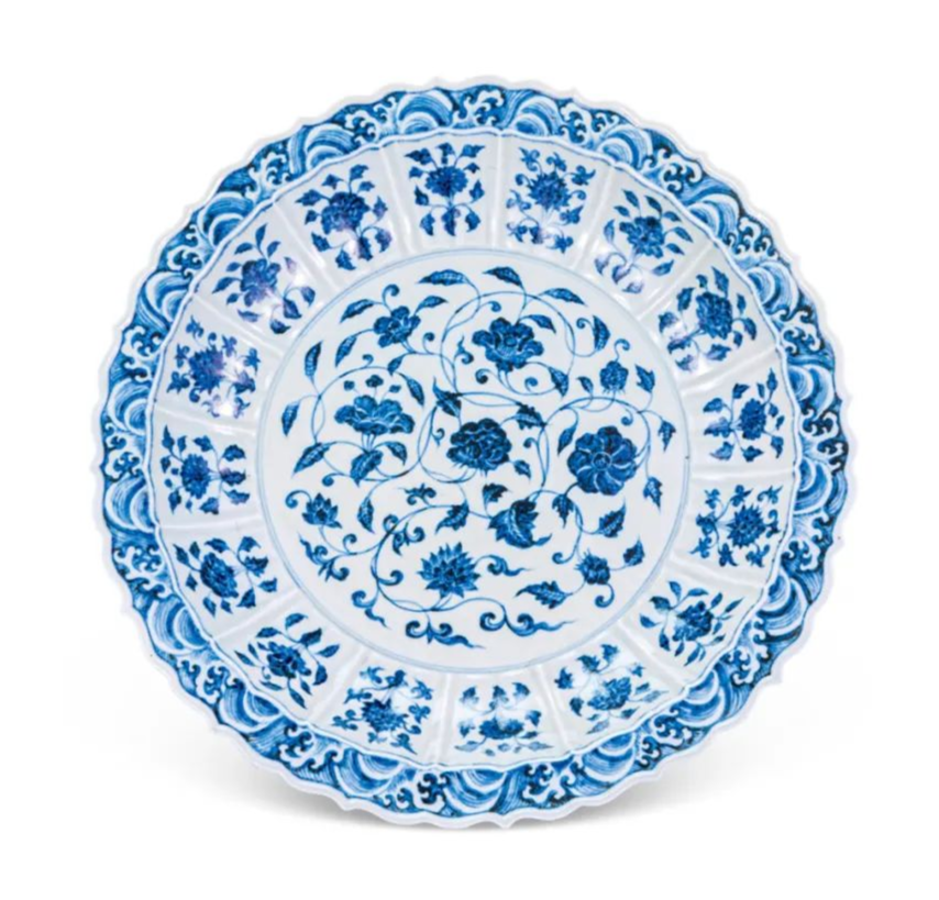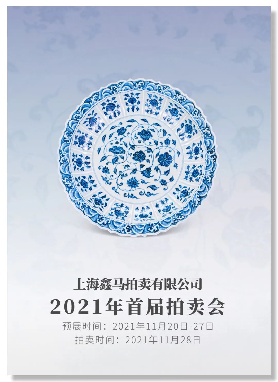 接下来,小编将对鑫马首拍的部分精彩拍品进行介绍。如需了解全部拍品,请点击文末“阅读原文”,即可浏览完整图录、参与竞拍。明代永乐时期是中国青花瓷生产的黄金时代,这一时期的御瓷青花大盘尺幅恢弘,式样丰富,造型多变,纹饰广泛,细分为二十余种,为历朝盘类之最。本次鑫马首拍瓷器版块的领衔精品便是一件明永乐 青花缠枝莲纹菱口大盘。拍品估价:1,800,000 - 3,000,000 人民币来源:美国旧金山收藏家 Harry Winston 旧藏1.北京保利拍卖2020秋季拍卖会,挹古芳——清康熙黄花梨雕螭龙螭凤纹双闷仓大四件柜 宫廷艺术与重要瓷器、玉器、工艺,Lot 1833;2.北京保利2012年秋季拍卖会,大明·格古,Lot 5564;3.北京匡时2011年春季艺术品拍卖会,瓷玉工艺专场,Lot 2861盘口绘一周海水浪涛纹,撇口折沿,浅弧腹,矮圈足,细砂底。胎体厚重坚实,施釉肥腴,釉色白中泛青。通体以青花为饰,盘心饰五朵缠枝花卉,内外壁绘十二式折枝花卉,均以小笔触勾勒,浓淡深浅,绘画灵动精妙,一如水墨作画,表现力极强。所绘花纹匀称分布,藤蔓绵绵,疏朗而饱满,纹饰写实传神,充分借鉴国画的笔墨意韵,得其法度,勾、勒、点、染诸法,运用皆宜。青花色泽鲜艳,有晕散,浓重处泛蓝黑色,并有黑斑。整器胎骨坚硬细白,釉质肥厚滋润,加之构图丰满有秩,画技精美,色调鲜艳和谐,制工精湛,造型华贵雅洁,为永乐官窑青花最具代表性器物之一。此类大盘器型始见于元代,非中国传统瓷器造型,而与中亚陶器及金属制大盘十分相似,应是适应中亚伊斯兰国家文化习俗所制,且为当地贵族围坐进餐之宴饮佳器。其口沿边饰的缠枝花卉纹更见浓郁的中东伊斯兰艺术之风格,因而此器不仅是陶瓷史中的重器,也无疑是中西交流的宝贵见证。