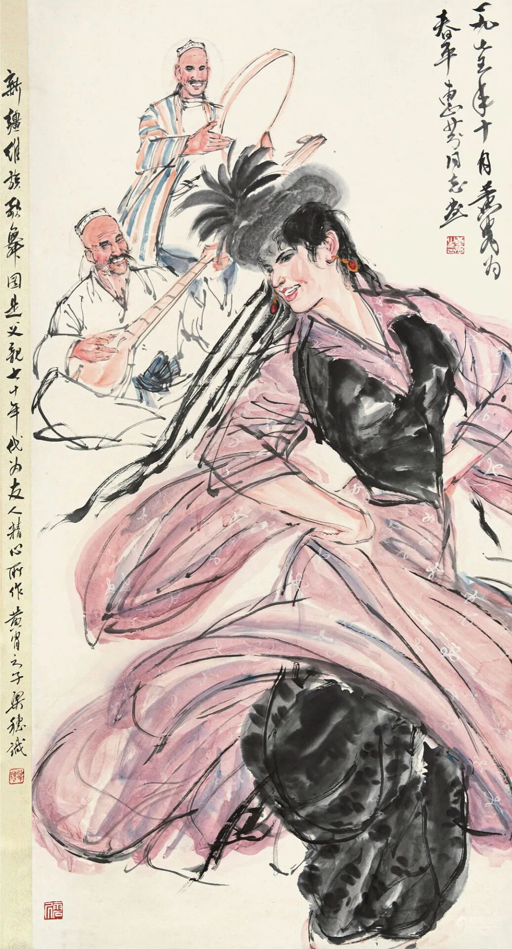 Lot 21026 黄胄(1925-1997) 新疆维族歌舞图梁穗题边跋:《新疆维族歌舞图》是父亲七十年代为友人精心所作,黄胄之子梁穗识。【钤印】梁穗2.此作品现藏家购于上海嘉禾2020年《禾风》—中国书画精品专场》;3.上款人“春平、惠芬”为谢春平、蔡惠芬夫妇:均为印度尼西亚华侨,曾在国家旅游局任职,与画家黄胄、白雪石、魏紫熙等均熟稔,亦常在生活上给画家予帮助。更与黄胄相交甚密,故所赠予作品均为黄胄所精心构思而绘制而成。