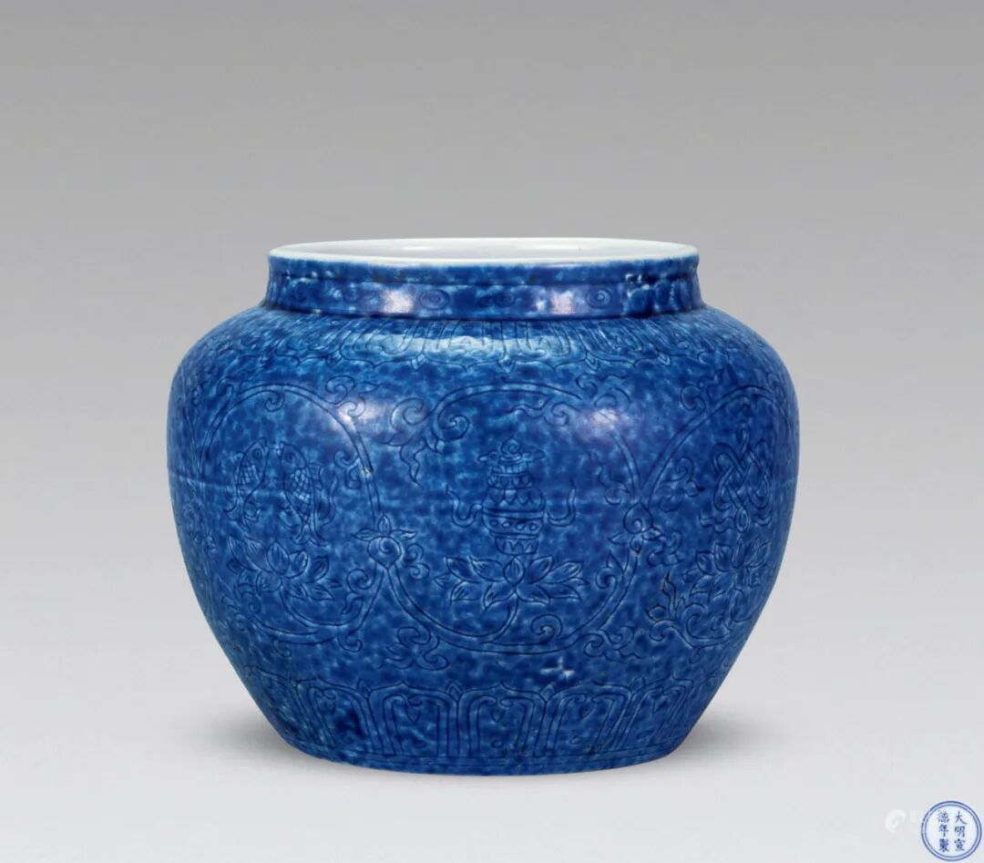拍品估价:360,000 - 500,000 人民币2.景德镇考古所博物馆藏,宣德洒蓝釉骰子钵、宣德洒蓝釉罐。洒蓝釉瓷器为明宣德时期景德镇创烧。洒蓝釉烧制工艺较为特殊,在瓷胎上先上白色釉,随后在烧成的白釉上用竹管蘸蓝釉,吹于器表,遂形成薄厚不均,深浅不同的斑点。因其在浅蓝地上有水迹般的深蓝色斑点,犹如洒落的蓝色水滴一样,故称“洒蓝”,而所余白釉地如同飘落的雪花,因此洒蓝釉又被称为“雪花蓝釉”。
