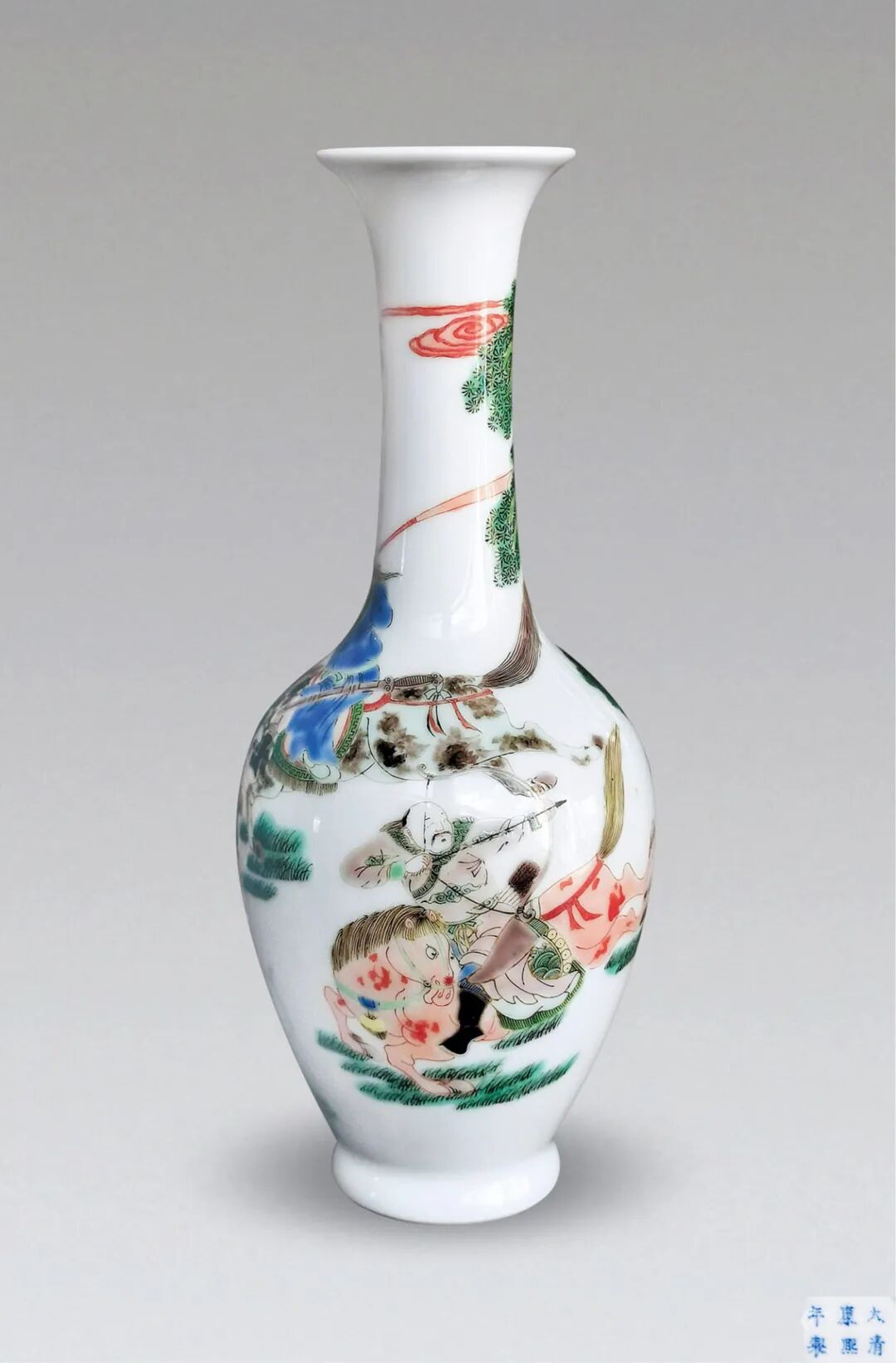 拍品估价:160,000 - 200,000 人民币1.纽约苏富比2017纽约亚洲艺术周,中国艺术珍品专场,Lot0678;2.纽约佳士得2016年9月拍卖会,美藏于斯专场,Lot0873本品造型秀美,挺拔端庄。撇口,长颈,微鼓腹,上腹外撇。通体里外施釉,釉面洁白肥厚滋润,圈足露胎,显现糯米胎质。外壁以五彩描绘纹饰,外壁绘狩猎图,典型康熙经典画法,画面构图疏朗有致,画意清远,景物起伏跌宕,纵深感极强,分色层次鲜明,将狩猎场面表现的异常热闹生动。满族为游牧民族,于弓马之上统一中原,最终建立清王朝。清代皇帝每年都要进行狩猎活动,除去本身之情感习俗,更重要的是保持八旗官兵传统之骁勇善战和醇朴刻苦的本色,抵御骄奢颓废等恶习的侵蚀。这件瓷器生动演绎了狩猎这一重要历史活动,类似题材的长颈作品极为少见,多见者为山水图及花卉纹或刀马战争场景,因此更为难得。