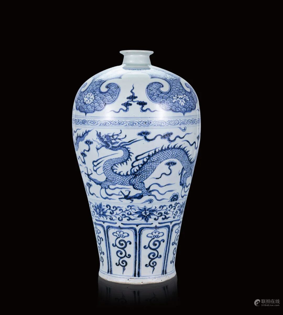 拍品估价:1,200,000 - 3,000,000 人民币来源:美国 Trio Maple Galleries 公司唇口短颈,丰肩收腹,腹部饱满、器形优美,足微撇。釉面光亮滋润,胎质白中显灰,气孔明显,底部的干裂现象原因可归结于修胎时瓷胎尚未足够干燥,胎泥还会继续干燥并收缩,导致底面开裂。肩部附图绘海水如意云头,下部附图绘变体莲瓣,中部主图绘四爪云龙飞舞,元青花以三爪、四爪为多,极少数五爪,以四爪龙纹为高等级。通体苏青料绘制,深沉明艳,凝聚斑明显,是难得的元青花大器。