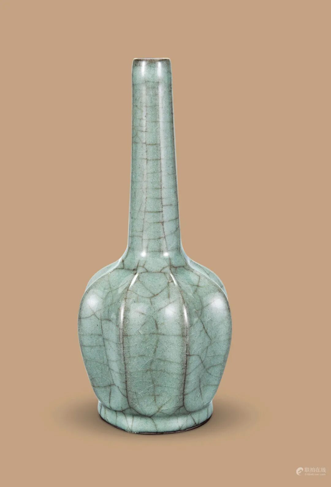 拍品估价:800,000 - 1,000,000 人民币4.东京国际オークション2021四季拍卖会第四回(瓷杂)LOT 1134修内司郊坛官窑瓷釉有月白、粉青、米黄三色,有冰裂纹,隐纹如鹰爪。明初曹昭《格古要论》言:官窑器宋修内司烧者土臃细润,色青带粉红,浓淡不一,有蟹爪纹紫口铁足,色好者与汝窑相类,有黑土者谓之乌泥窑,伪者皆龙泉所烧者,无纹路。此瓶直口,圆唇,长颈,溜肩,收腹,八棱,铁足。通体施青釉,青灰胎,胎质致密,釉质为青绿色,器身大开片,布满铁线,釉层肥厚,光润,抚之光滑如肌肤。