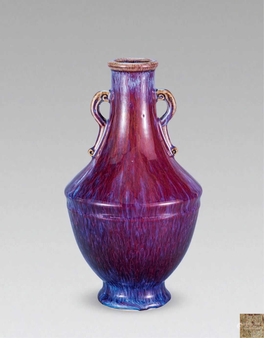 拍品估价:160,000 - 200,000 人民币1.北京荣宝第70期艺术品拍卖会,古董文玩专场,LOT号1557;2.北京翰海2017春季拍卖会,中国古董珍玩专场,LOT号2609;1.《故宫博物院藏文物珍品大系——颜色釉》P200;2.《首都博物馆藏瓷选》,文物出版社,1991年,页156,图159;3.《中国陶瓷全集---清(下)》,上海人民美术出版社,1999年,图113窑变釉是唐英督理景德镇御窑厂时仿钧窑釉色所繁衍出的一个创新品种。钧窑为宋代五大名窑之一,它将含有不同呈色元素的色釉融于一体,在窑炉中高温烧制,釉料相互交融,自然流淌,在熔融过程中,呈现色彩斑澜的釉色,千种风姿,万般异彩。借用唐诗来赞美窑变釉恰如其分,“高山云雾霞一朵,烟光空中星满天,峡峪飞瀑兔丝缕,夕阳紫翠忽成岚”。