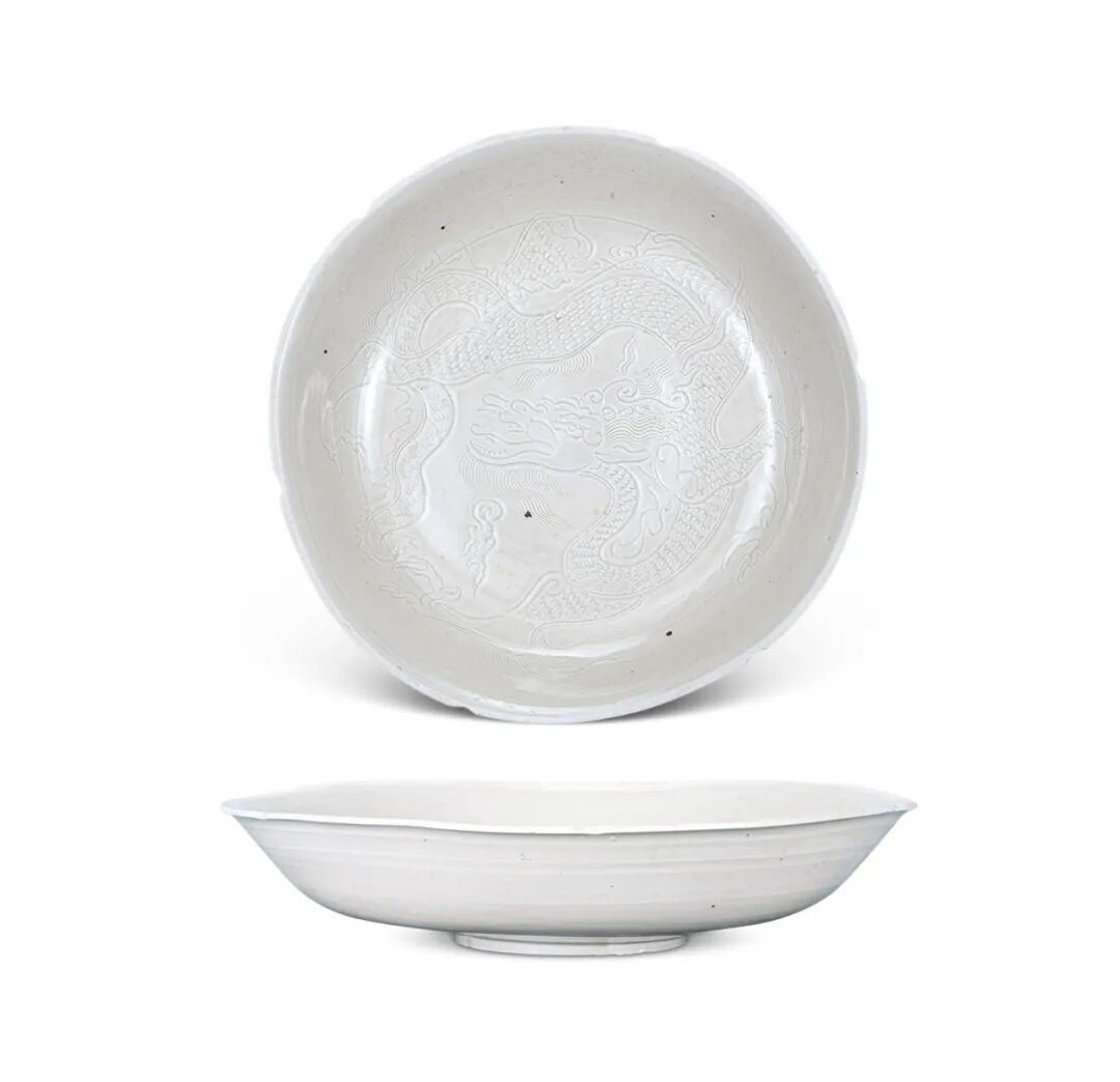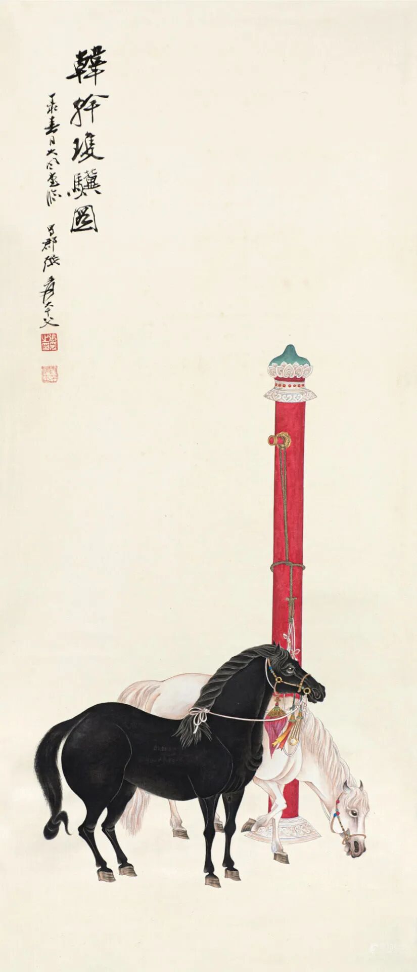 参考:西泠印社2018年秋季拍卖会,中国历代瓷器专场,Lot号1906此盘为定窑产品中的经典之作,盘敞口,弧形浅腹,矮圈足,内外均施象牙色白釉。较同类作品特殊之处在于,此件盘心刻画龙纹,刀工古朴雅致,不见滞涩,龙身轮廓线外另加复线以增强立体感,盘龙全身披鳞挂甲,龙有三爪,体态矫健,昂首张口,双目圆睁,其技艺之高,丝毫不逊于同期书画之极精品者。而盘内外素白无纹,突出主题龙纹,故整体观之,愈见精妙。定窑刻画花器物比印花制作早,而三爪龙纹应为南宋至元代的龙纹典型风格。故而此件龙纹器物贵在属定窑官制之器。书画版块先来看一幅张大千拟韩干笔意而作的《双骏图》。韩干画马十分重视写生,所画之马线条遒劲,且极富弹性,用笔简练,渲染不多,但能突出所画对象的体积感及质感,常喜画肉不画骨,但骨肉均匀,能显风骨。Lot 21016 张大千(1899-1983) 韩干双骥图