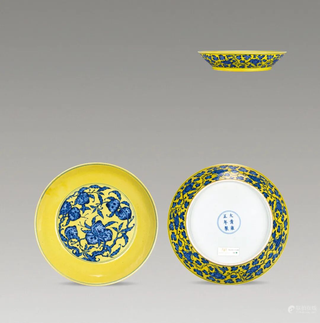 拍品估价:300,000 - 500,000 人民币来源:美国劳伦公司,2018年12月中国古董专场,美国收藏家 Arlin Holmes 收藏专场1.北京瀚海2011春季拍卖会,古董珍玩专场,Lot 3065;2.中国嘉德2012春季拍卖会,古瓷萃珍,Lot 2642;3.香港苏富比2011春季拍卖会,玫茵堂珍重要中国御瓷选萃,Lot 0074此盘敞口、弧壁、圈足。足底书青花双圈“大清雍正年制”六字双行楷书款。通体黄釉地青花绘纹样,盘内心为折枝九桃纹,枝繁叶茂,硕果累累,蟠桃丰硕诱人,写实鲜活。外壁通绘缠枝牵牛花纹,或含苞待放,或花开正艳,层次清晰典雅。所绘纹饰笔触灵动,点涂苍雅,状物有神。充分运用勾、涂、点、染等施彩技法,笔触细腻,立体感强。纹饰布局考究,清新之气,跃然眼前。青花浓艳青翠,黄釉明快娇亮,上下相映,光彩夺目。由于桃类栽培历史久远,所以自古流传许多关于桃的神话传说。根据《山海经》,民间迷信桃木可以避邪治鬼,桃木剑更能镇宅纳福,在后来流行的道教神话中,主宰人寿命的南极仙翁经常手托鲜桃,寓意幸福长寿。此纹饰的盘、碗、瓶正是雍正时期开始烧制,构图疏密有致,绘画精细绝美,青花发色完美明艳,乃清代宫廷用瓷精品。