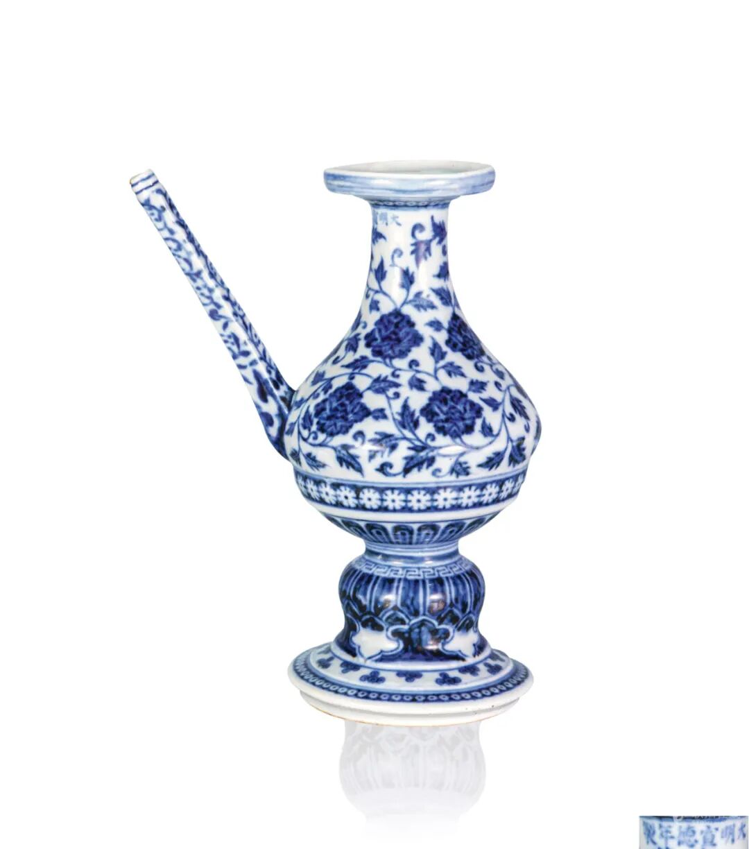 拍品估价:600,000 - 1,000,000 人民币2.香港苏富比2016年春季拍卖会,赏心菁华--琵金顿珍藏重要中国工艺精品,Lot0015。永宣青花,古陶瓷学界专有名词,特指明代永乐、宣德两朝烧造的青花瓷。明代永宣两朝的30余年里烧造的青花瓷,在青花瓷烧造历史上堪称稀世珍品。其异域风格的造型、浓重明艳的呈色、超凡脱俗的纹饰,被后人赞誉为“发旷古之未有,开一代之奇葩”。此件净水瓶撇口,圆唇,细颈,垂腹,腹下连以台座式托。上半部主体为玉壶春瓶式样。足内呈台阶状,有里外两圈涩圈,系窑内烧成时使用垫圈垫烧的部位。腹一侧置长流,无柄。通体青花缠枝牡丹纹。净水瓶有多种式样,这种造型的净水瓶创烧于永乐时期的景德镇官窑,宣德时也有烧造,品种有青花、白釉等,永乐器不署年款,宣德器署年款。净水瓶原用途应为伊斯兰教信徒做礼拜时饮水或净手的用器。此青花缠枝牡丹纹净水瓶,精巧臻致,尽展艺匠超凡造诣。其一藏于北京故宫博物院,亦见于《乾隆皇帝是一是二图》(绘于十八世纪)。本瓶应为宣德宫廷礼佛宝器,仅用于重要仪式,故珍贵无比。