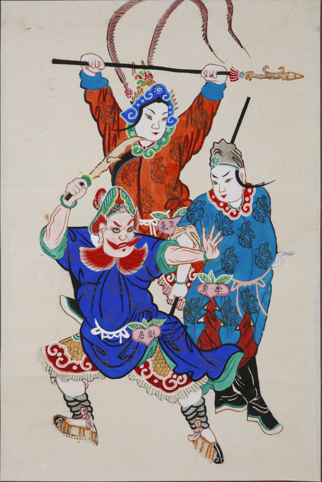 水浒人物门画共有一套十八对,每对绘制六个水浒人物。这件年画作品是其中的一幅,呈现的是“飞天大圣”李衮、“赤发鬼”刘唐,“独火星”孔亮三位水浒人物。