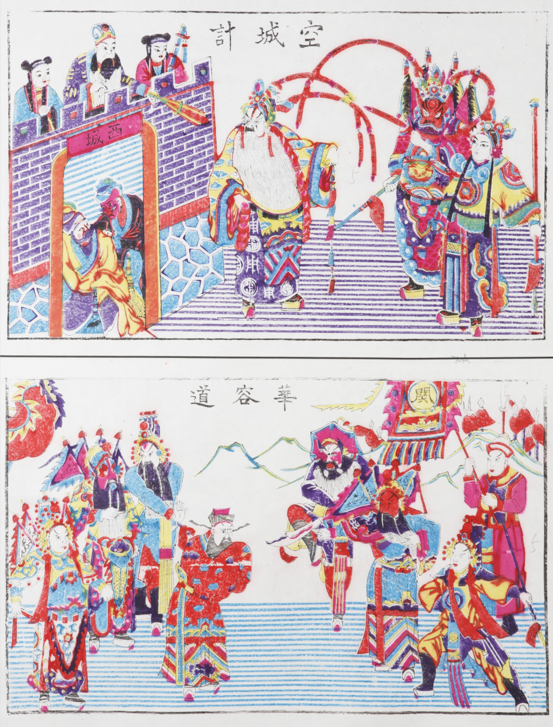 此年画上下两幅装作一轴,均出自中国古典名著《三国演义》。上方《空城计》也是京剧的传统剧目之一,讲述的是三国时期,魏国的司马懿进攻蜀国街亭,诸葛亮派马谡驻守,马谡因刚愎自用而失败。司马懿率兵乘胜直逼西城,诸葛亮无兵迎敌,但仍然沉着镇定,大开城门,自己在城楼上悠闲地抚琴饮酒。司马懿怀疑城中设有埋伏,引兵退去。画面中角色装扮、城楼布景,都符合舞台演出实景。