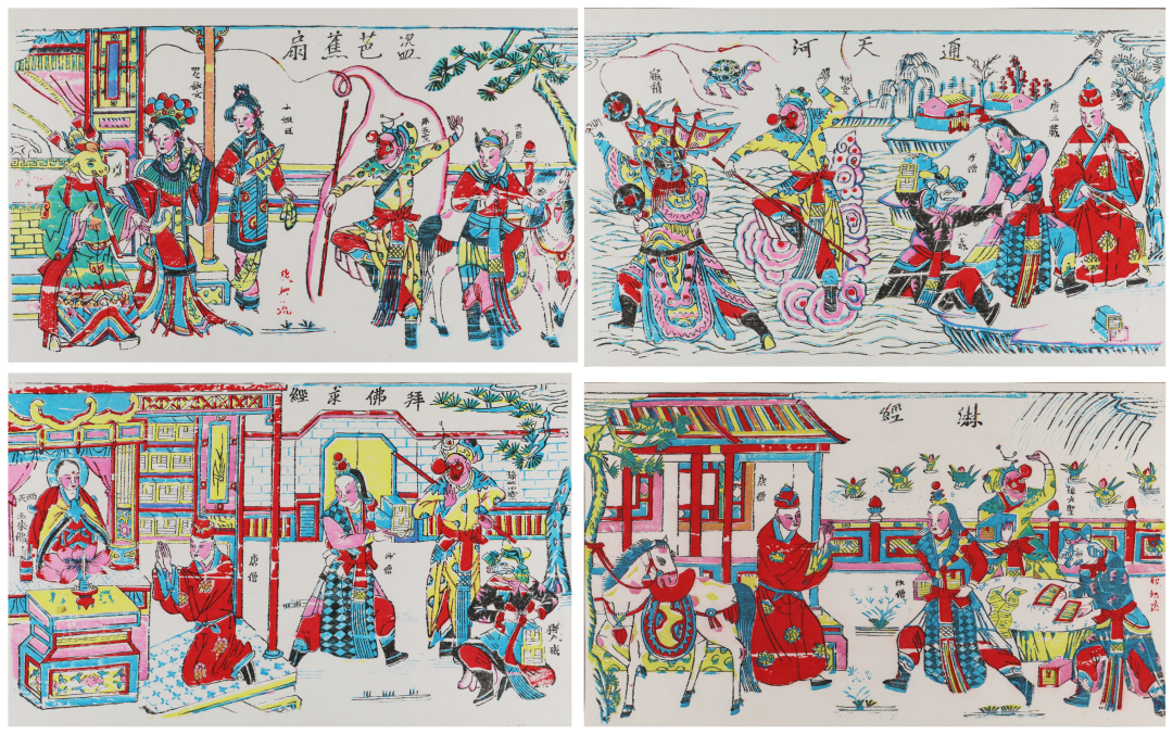 此四幅年画中最吸引人的莫过于驾着精斗云,手握金箍棒的孙悟空。京剧表演中专门翻跟斗或者跌扑为主的为翻扑武生,一般专门表演以《西游记》中仙猴孙悟空为题材的剧目。因为孙悟空是神猴,动作除了伶俐敏捷以外,还要气魄十足,表演要求细腻传神。在京剧里,有些孙悟空的戏,也由武丑来应工,但比较少,大部分都是由武生来扮演。