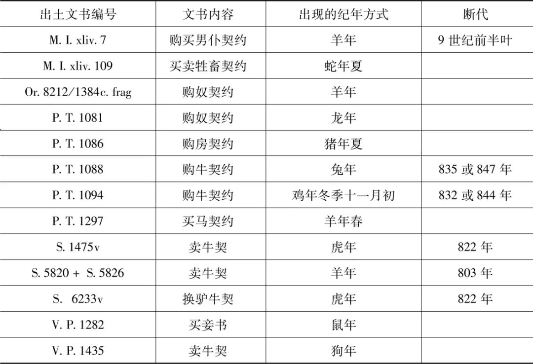 在上表所列文书中,P.T.1094、P.T.1297、M.I.xliv.7都有吐蕃官员充当证人并签名盖印,可见这类契约应由吐蕃官方颁发,并且往往要由吐蕃官员充当证人以证明其合法性;内容同样较为完整的M.I.xliv.109系原件,其中只有两名证人,从其姓名来看都非吐蕃官员,另外尚留有一个空位等待签名,很可能即是为吐蕃官员充当证人的签名和印章而预留,然而此件契约因为有关手续不够完备而最终未能生效并签署;S.1475v、S.5820、S.5826、S.6233v、V.P.1282、V.P.1435只包括买主、卖主、买卖对象、价钱和保人,缺少相应官府的信息,显然应是私契;P.T.1088为契约抄件,没有抄出证人姓名等内容。由上可见,在大致8世纪前后的吐蕃,仅就契约文书而言,无论是官方或是民间都无一例外地采用生肖纪年方式。