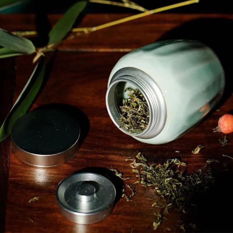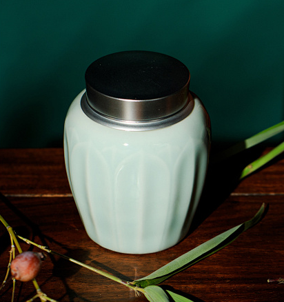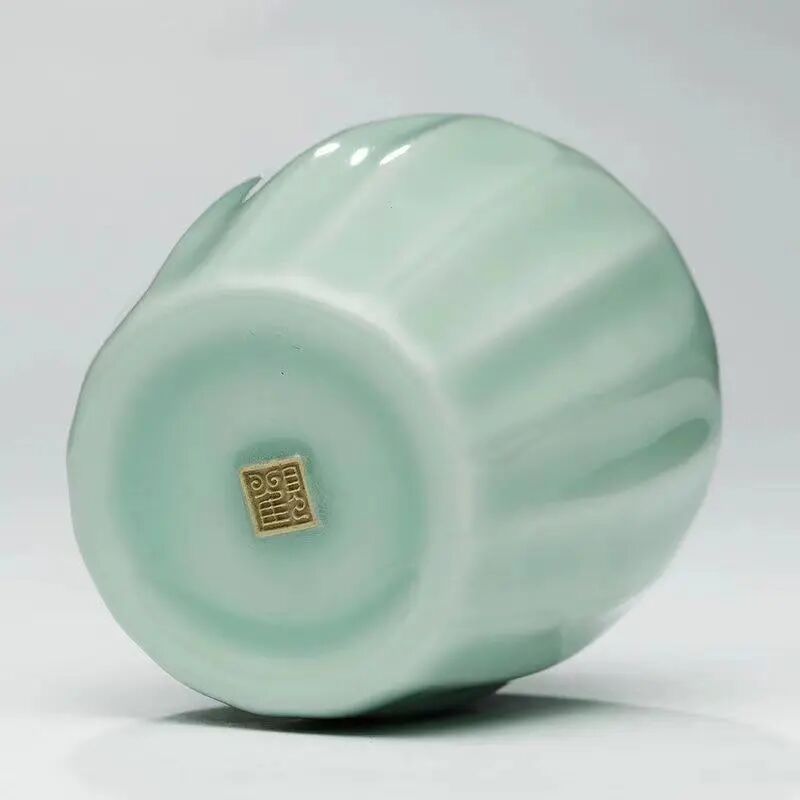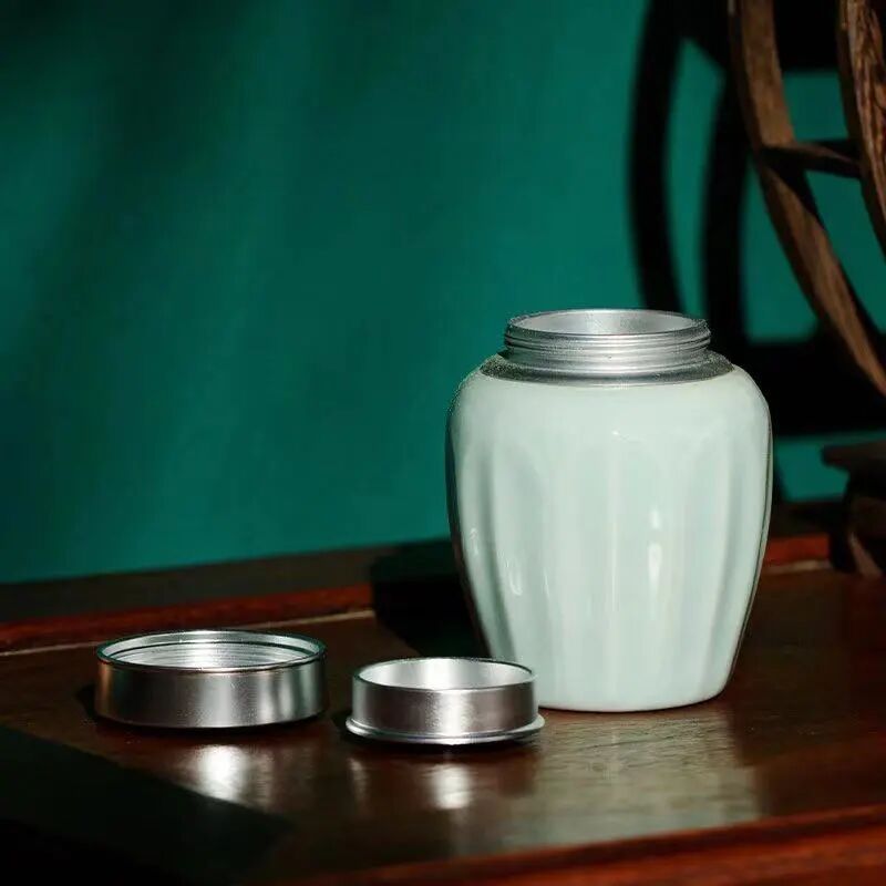 此「粉青釉莲瓣小茶罐」取龙泉粉青釉色,柔润嫩青,似薄雾中荷叶田田。