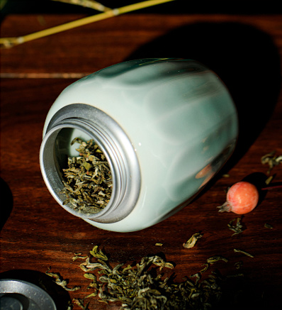 茶罐罐体以双重仰瓣莲为饰,莲瓣窄长,中间出筋,层次分明,清雅俊逸。