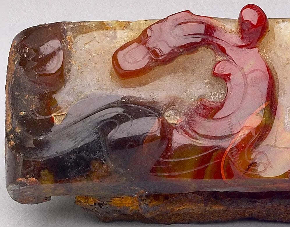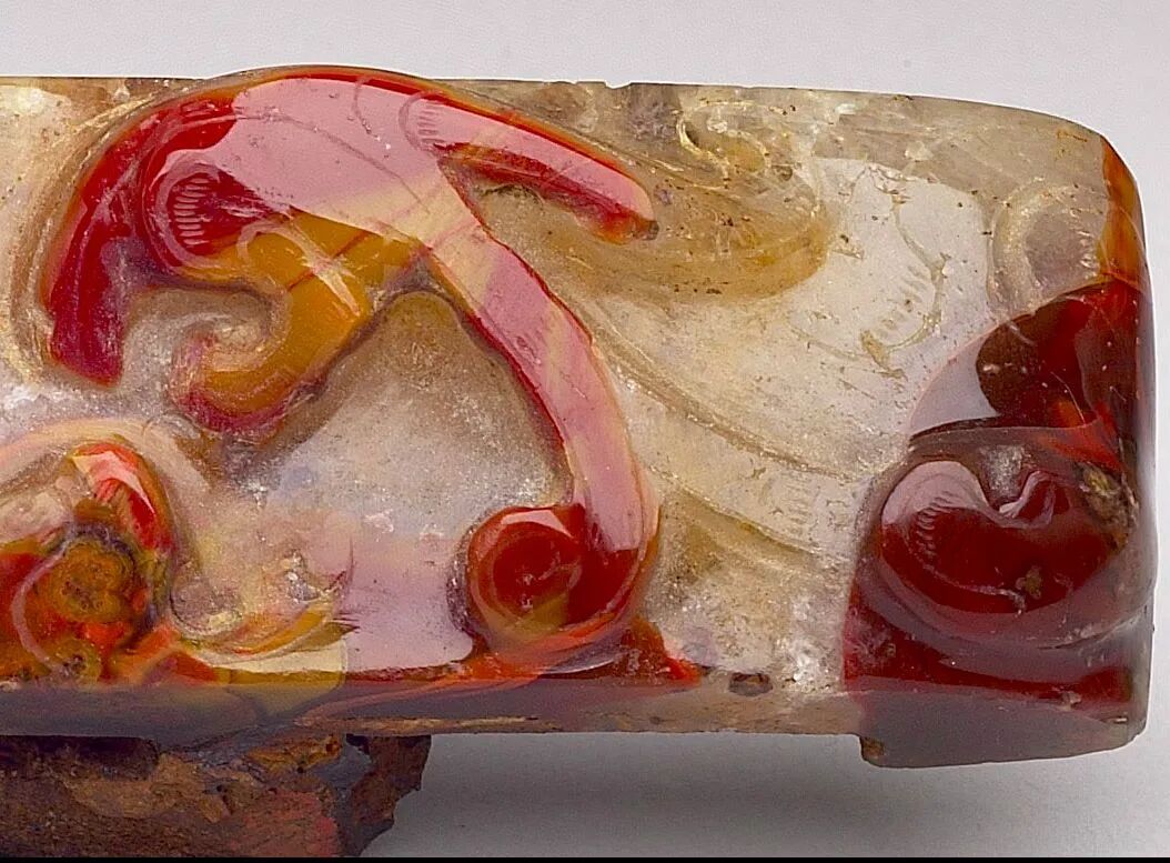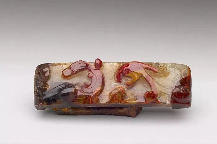 西汉中晚期,龙纹玛瑙剑璏,长9.3 公分、宽2.6 公分、连铁高2.6 公分。