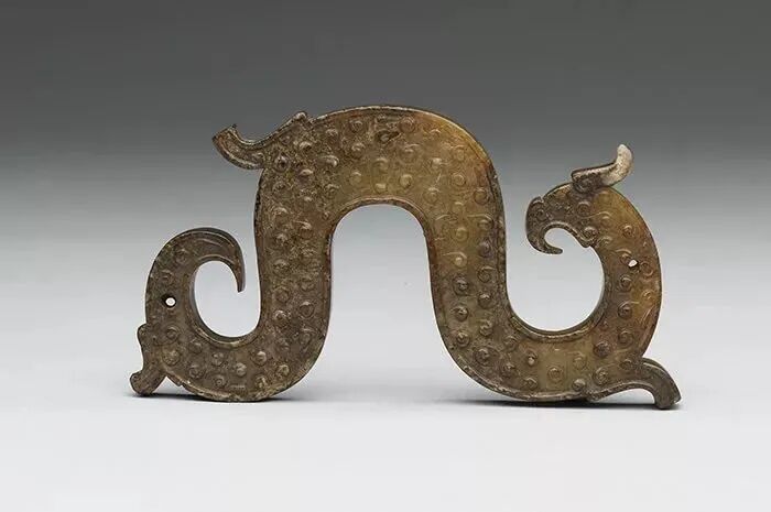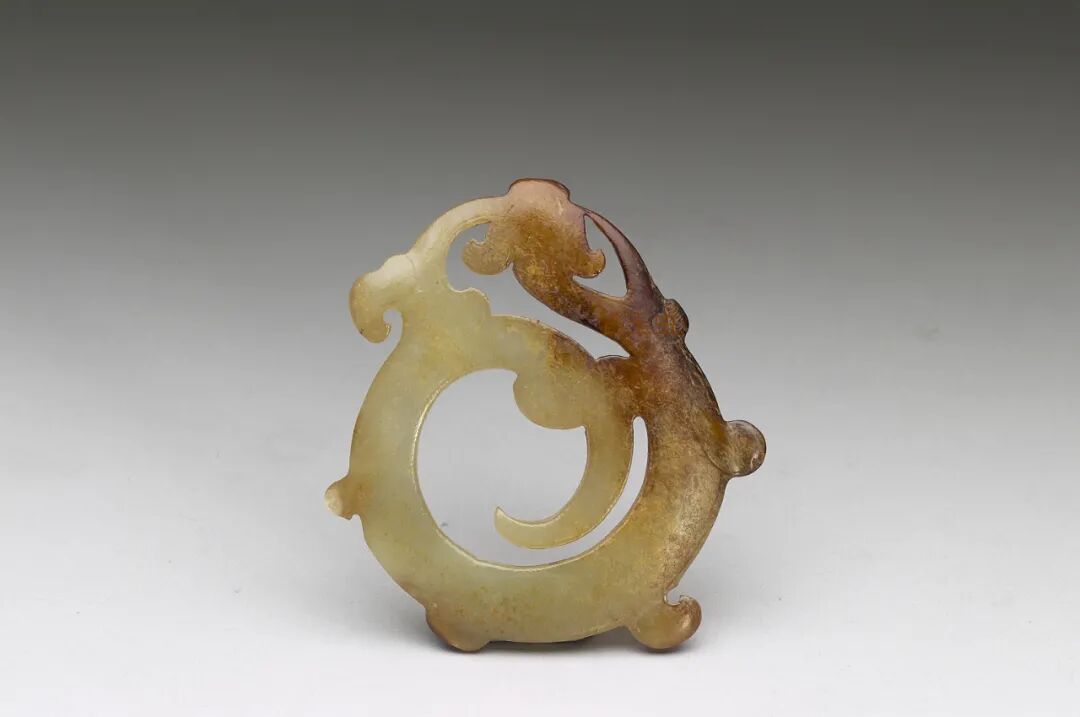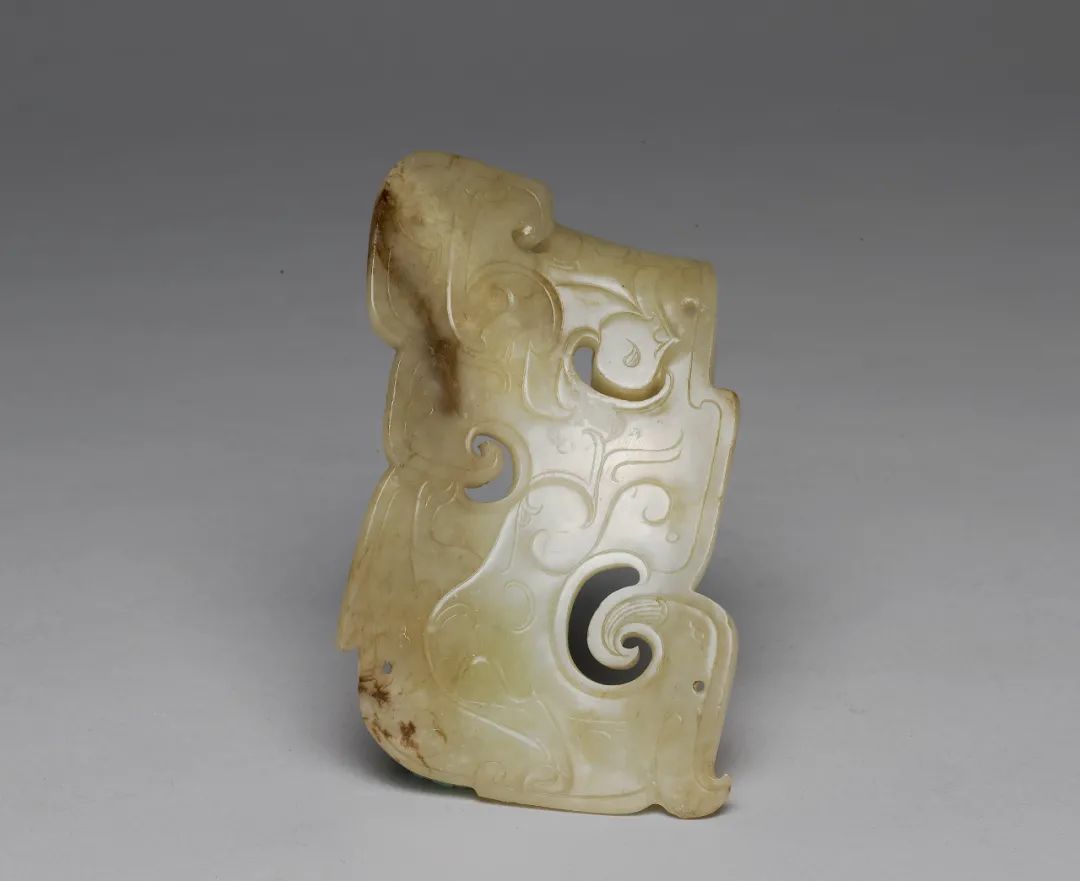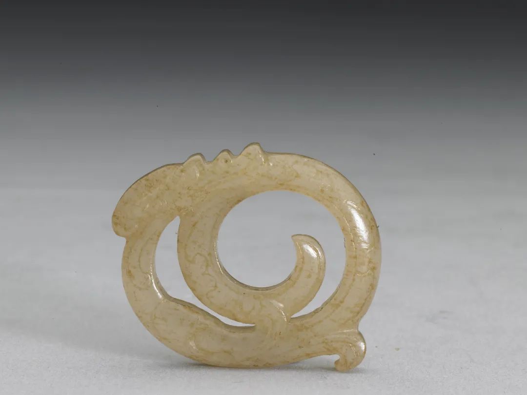 青白玉,有褐斑,雕工自然流畅,富古朴之趣。全器使用去地浅浮雕、阴线刻、镂空等制玉技法完成。龙作回首状,身躯似欲作S型,自颈部以下起伏两次,起伏与起伏间留有空间,因此,正面观之,犹如两个起伏圈紧邻并排,尾部上扬,动感十足。