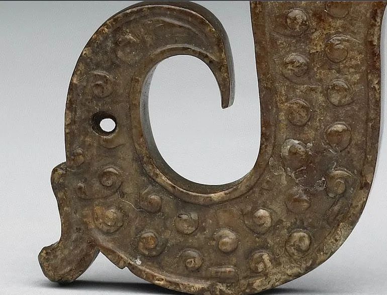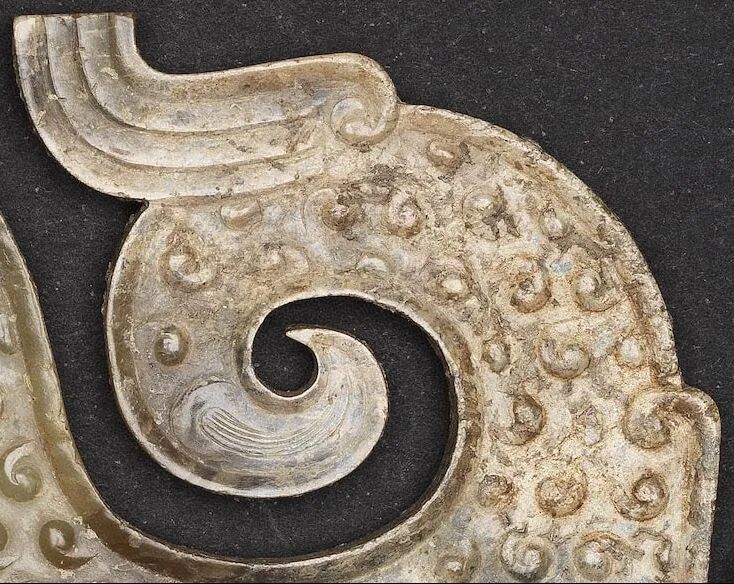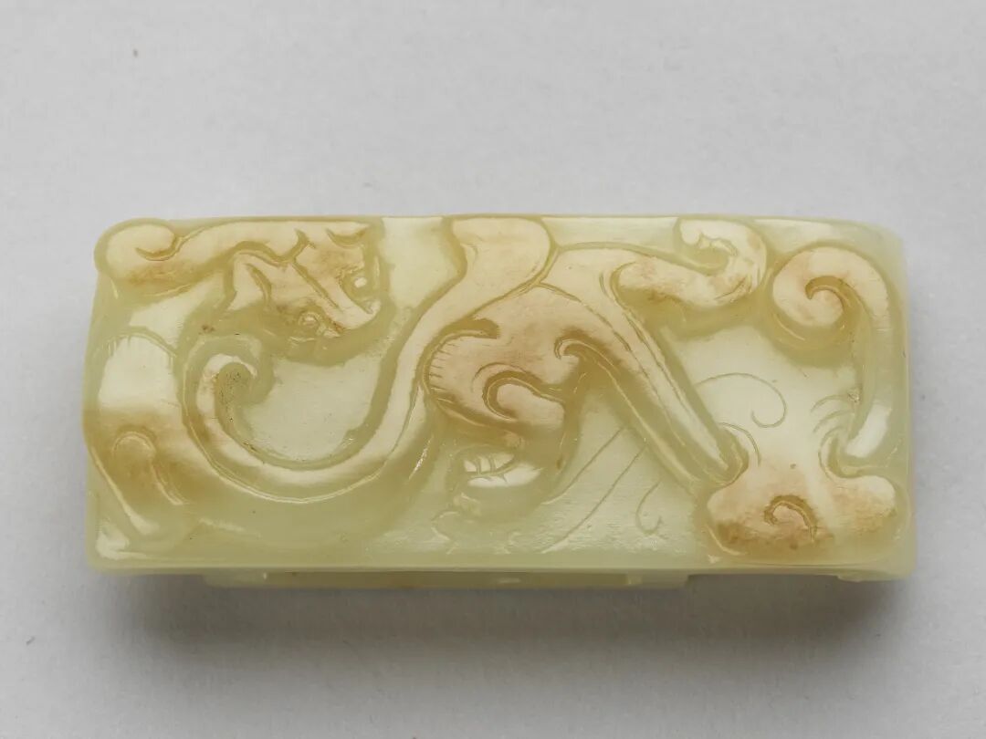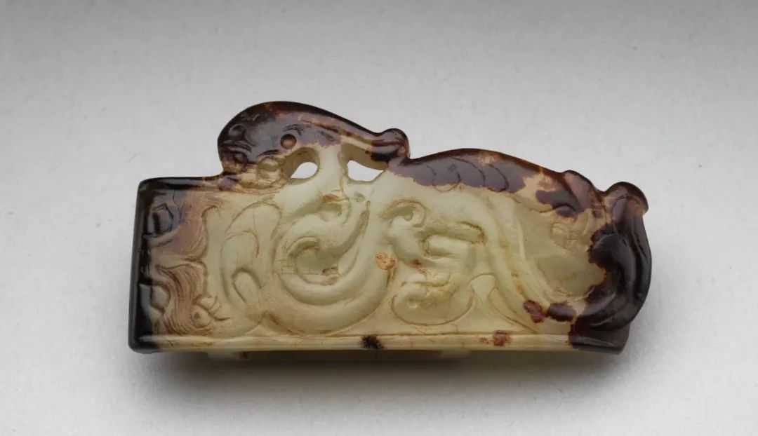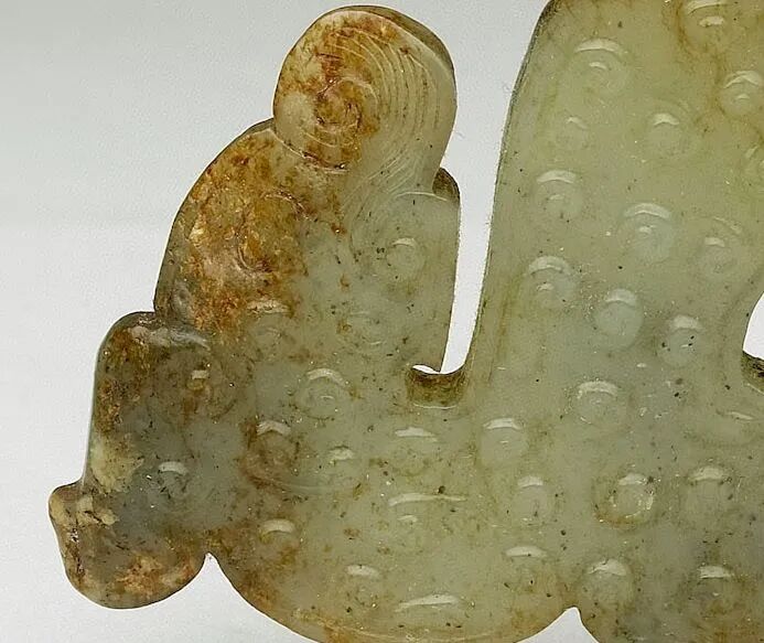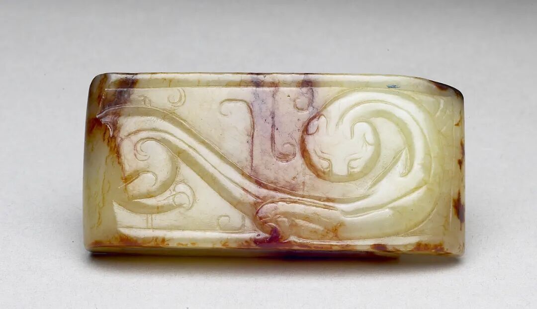 青白玉,有褐斑,雕工自然流畅,富古朴之趣。全器使用去地浅浮雕、阴线刻、镂空等制玉技法完成。龙作回首状,身躯似欲作S型,自颈部以下起伏两次,起伏与起伏间留有空间,因此,正面观之,犹如两个起伏圈紧邻并排,尾部上扬,动感十足。