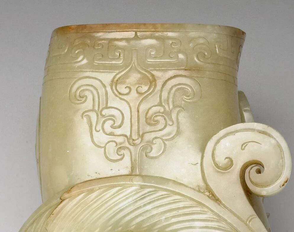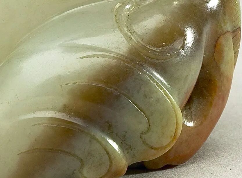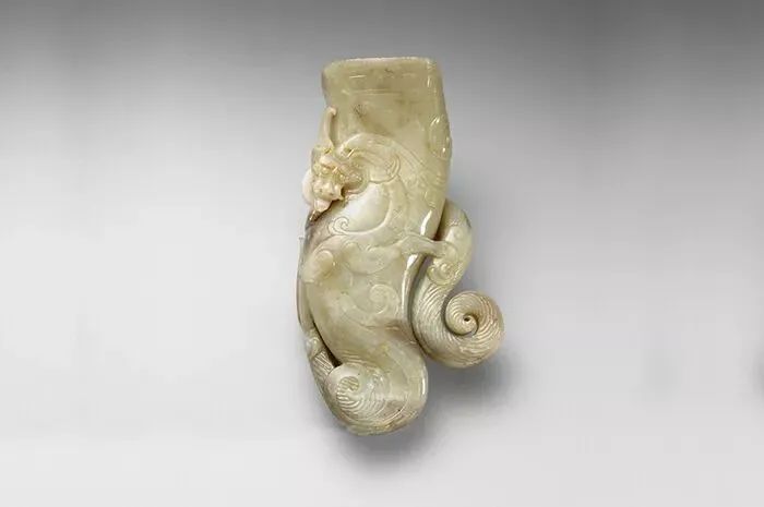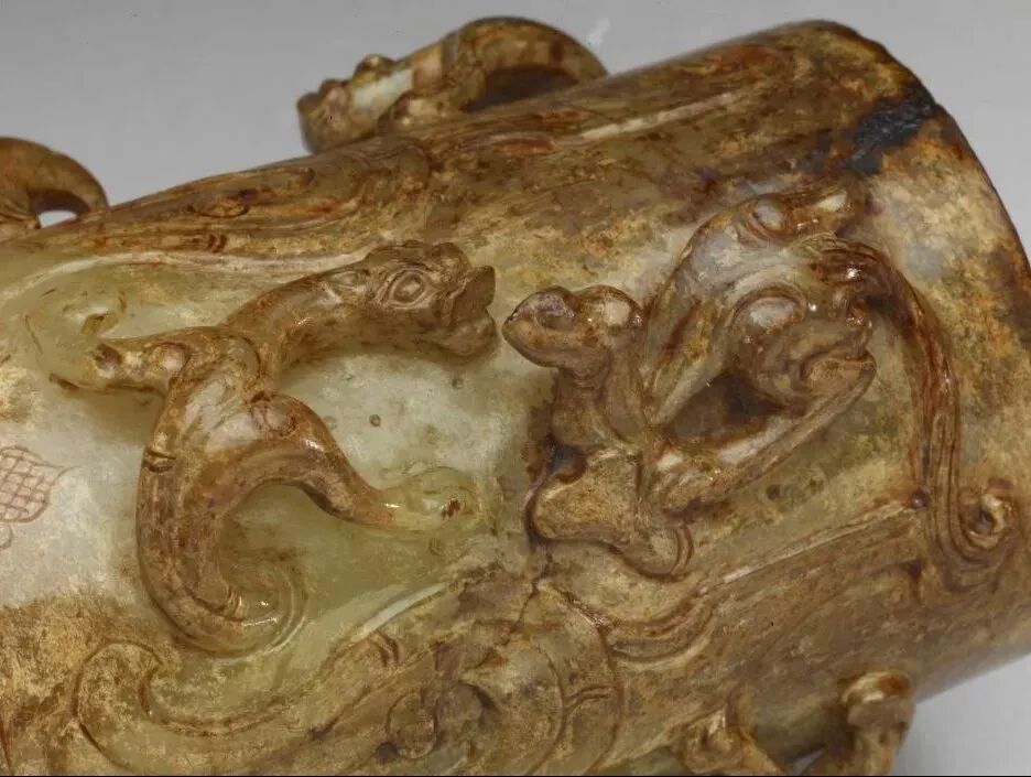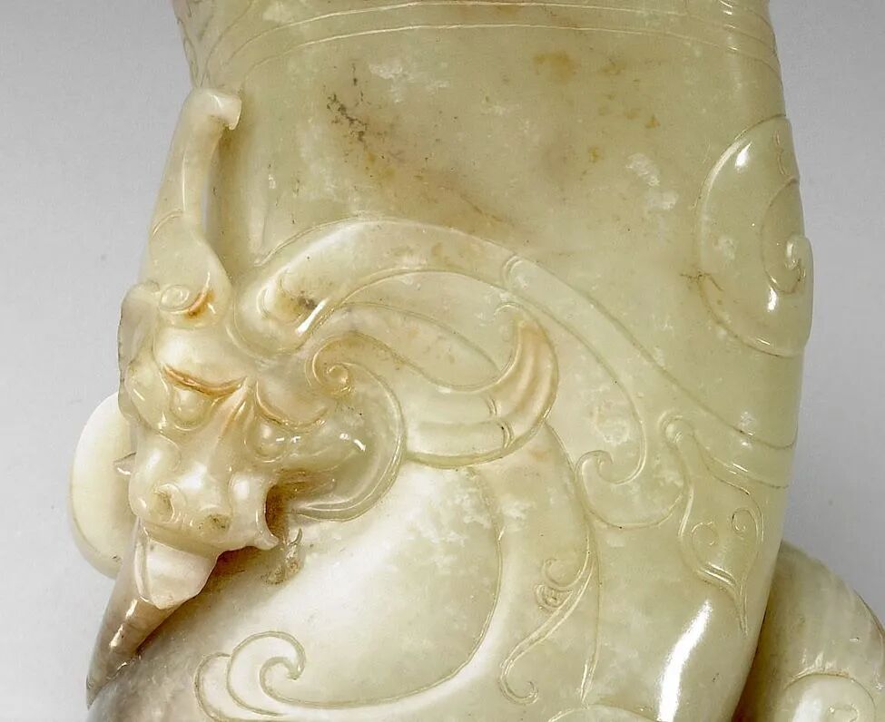 玉色白里透褐黄,雕工极精细。全器作角杯型,器表浮雕一龙蟠绕,龙体矫健有力地凸显了汉代工艺的雄浑气势。