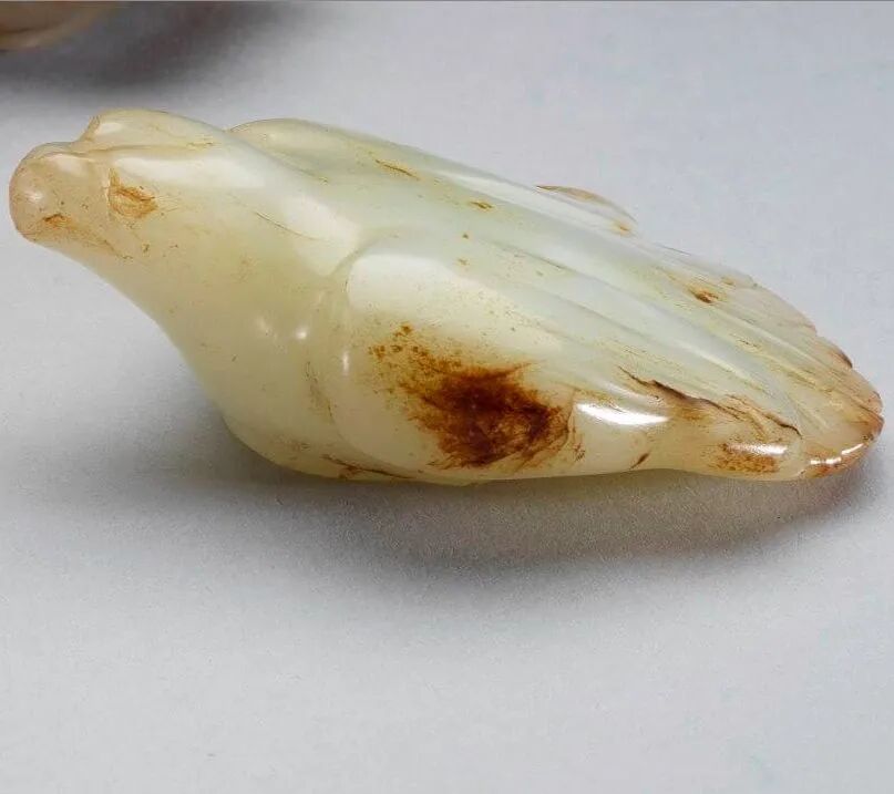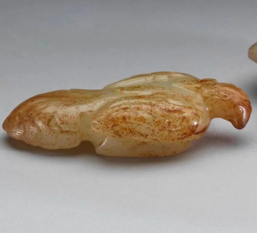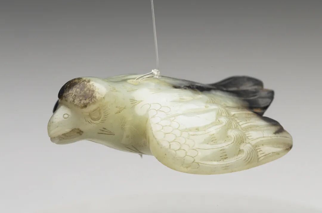 青玉,光泽莹润,带黄赭斑。作长尾鸟,羽丰体硕,头上一束长羽。器表有许多细微的刮痕,眼睛部位尤明显。