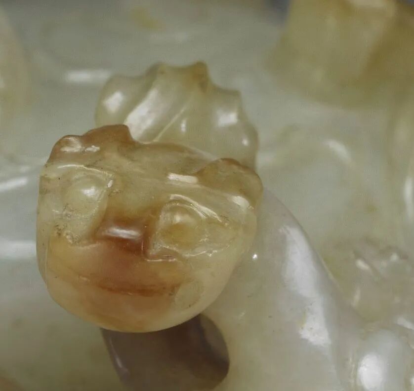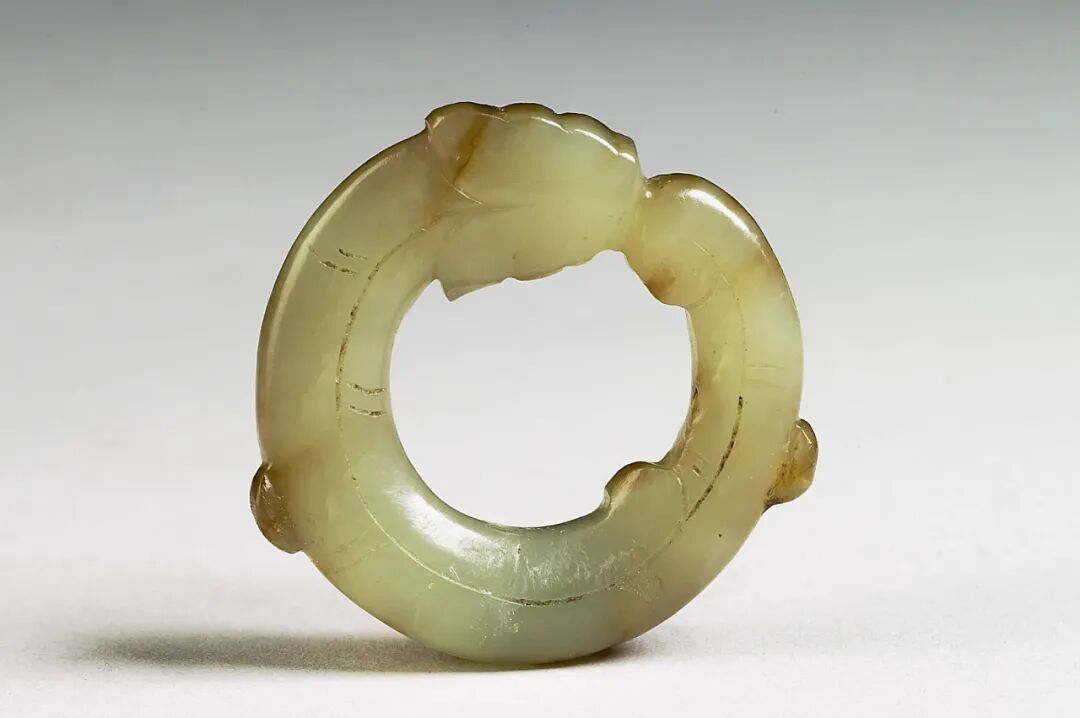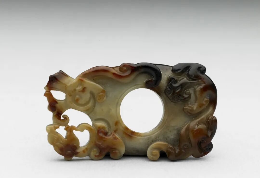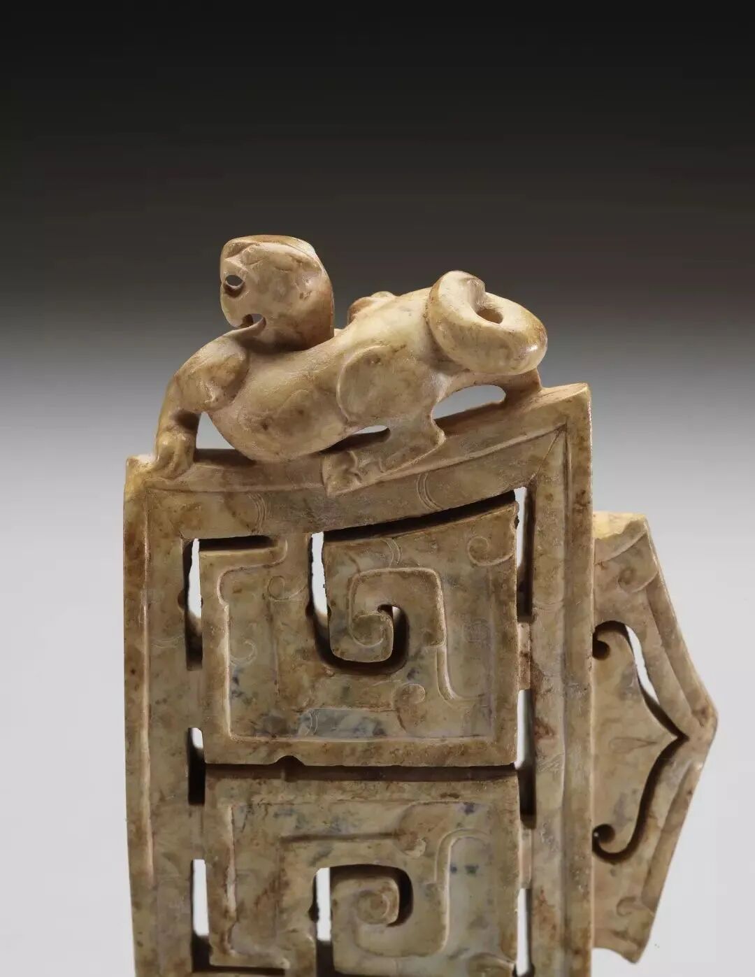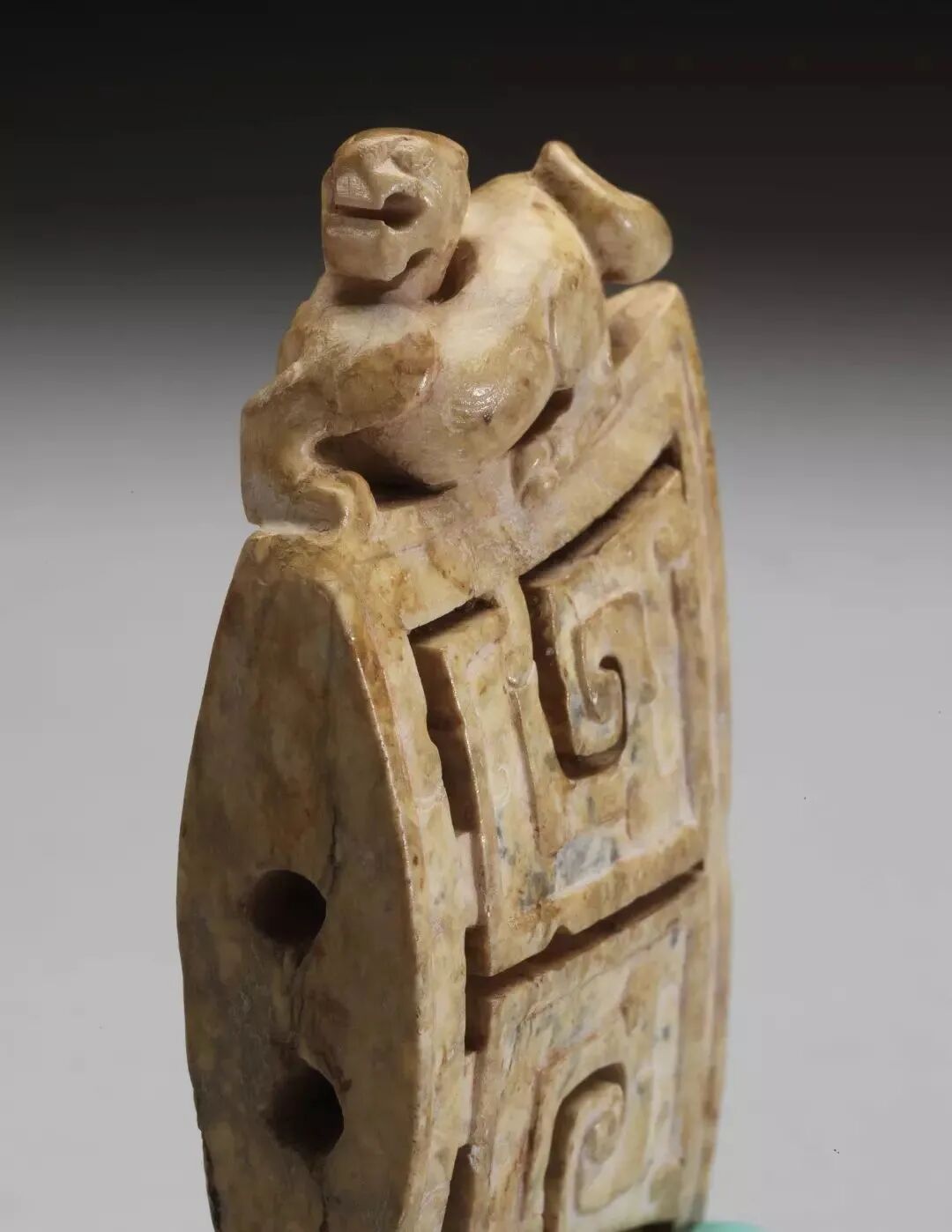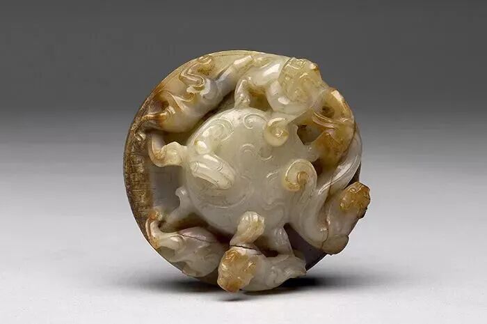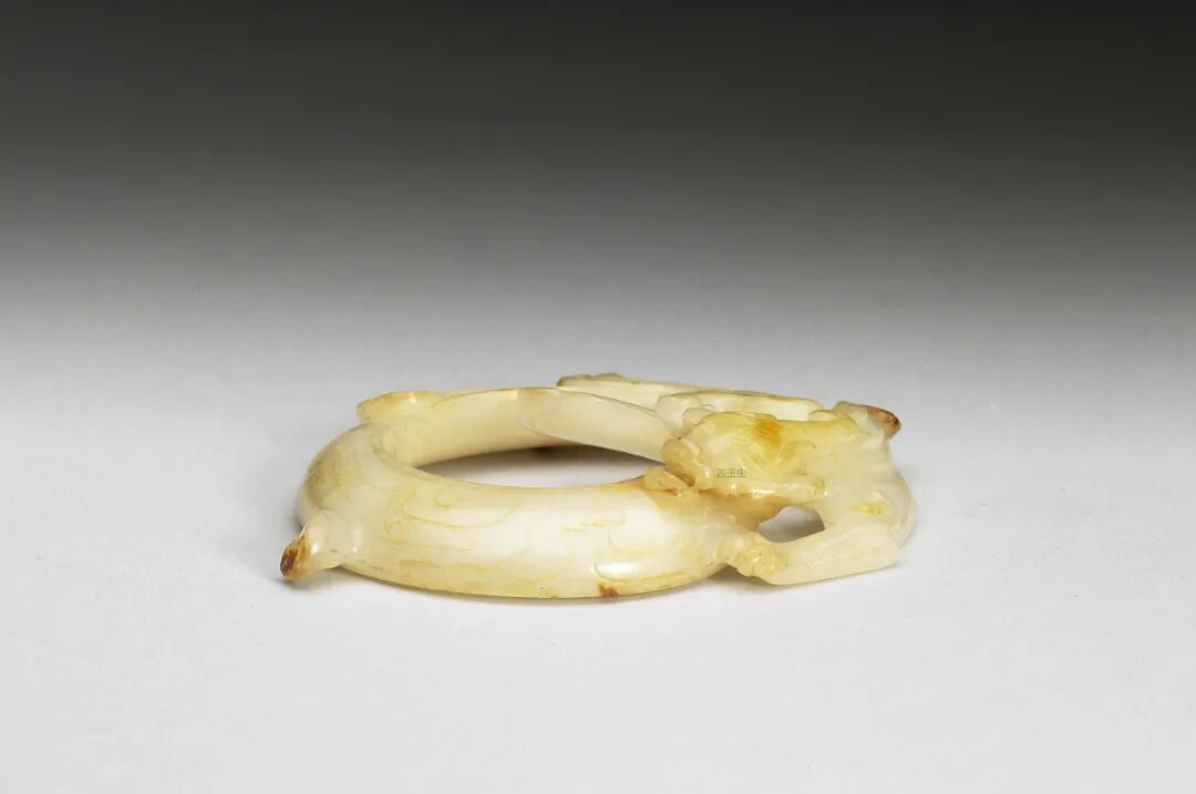 圆形的玉剑首上攀附着三只神兽,它们身躯过度扭转、首与尾的方向性完全不一致,乍看之下却毫无异状,异常和谐。
