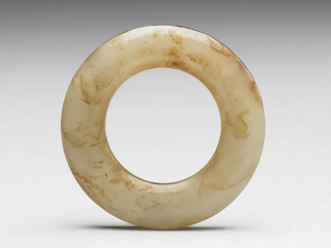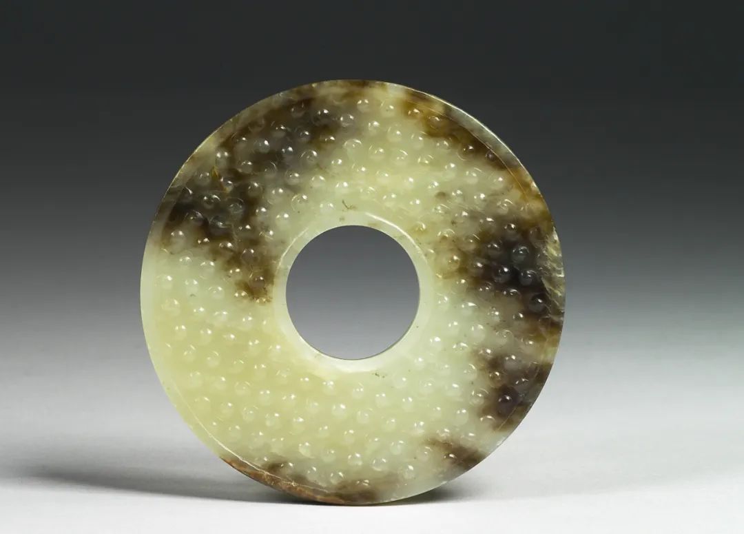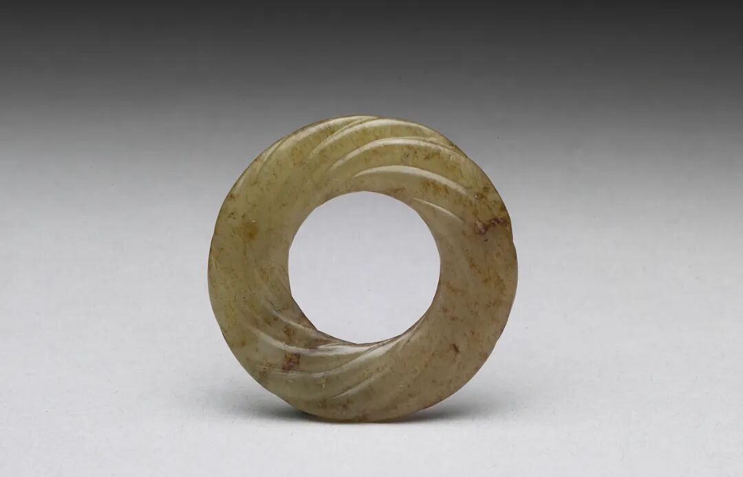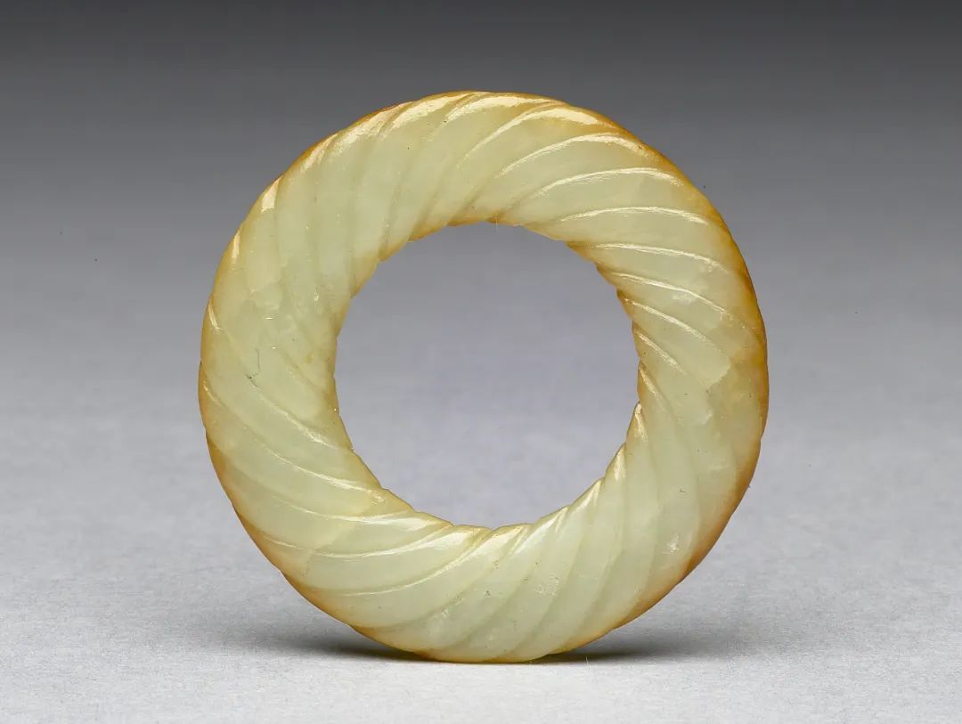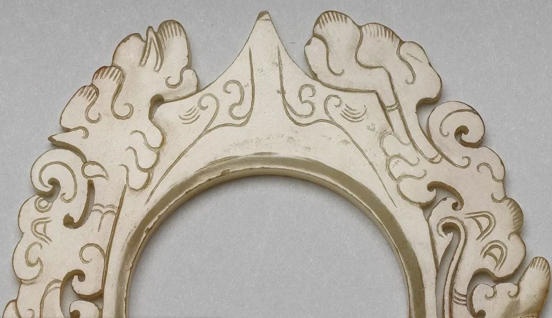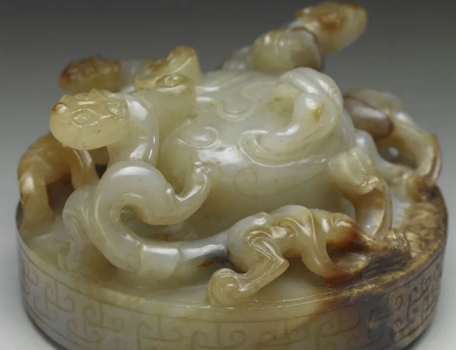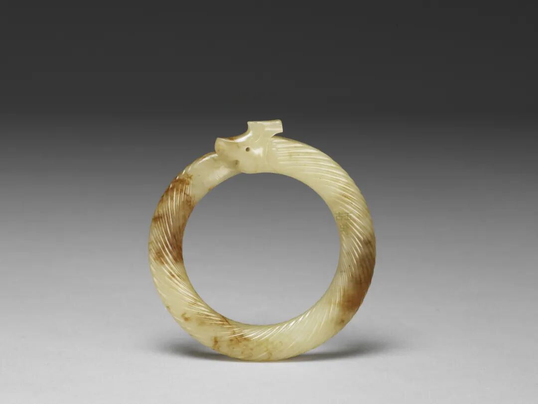 圆形的玉剑首上攀附着三只神兽,它们身躯过度扭转、首与尾的方向性完全不一致,乍看之下却毫无异状,异常和谐。