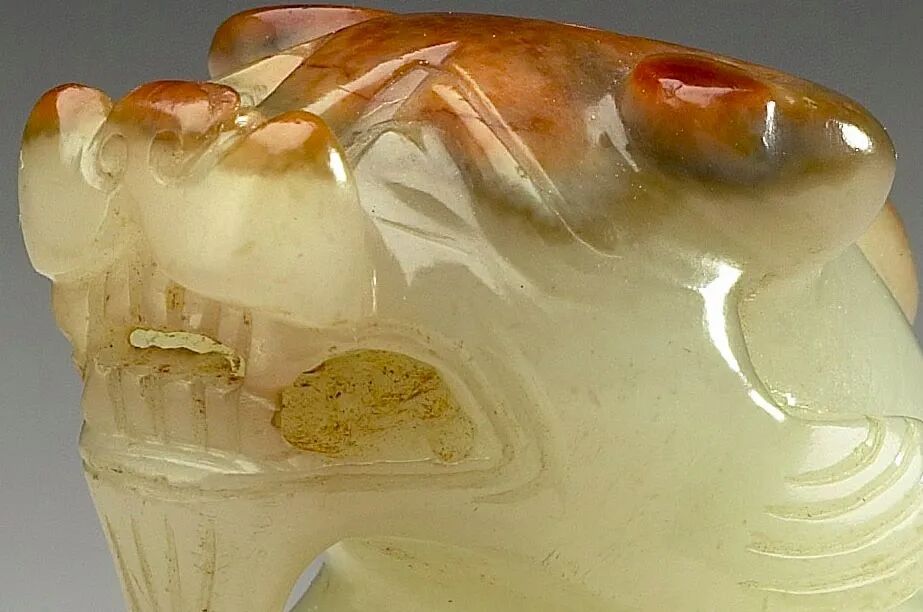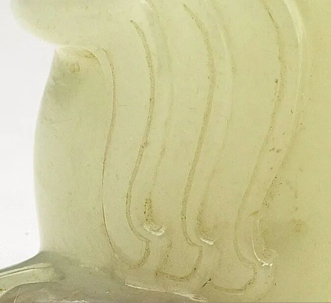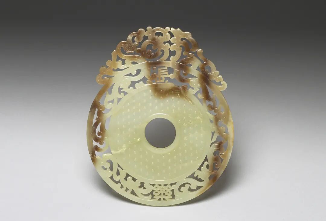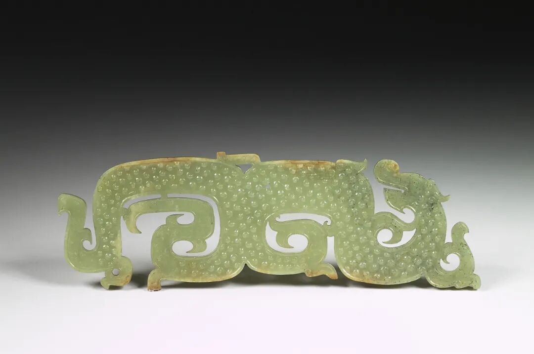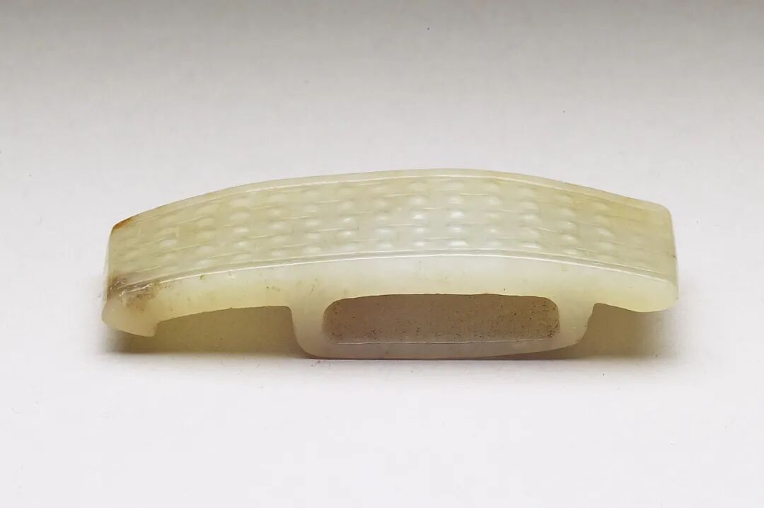 全器沁作不透明的乳白色。剑珌是镶嵌于剑鞘下端的玉饰。此器以镂空与浮雕的技法,琢出回绕的几何纹饰,一侧尚立雕一骁健的螭虎。