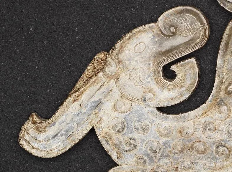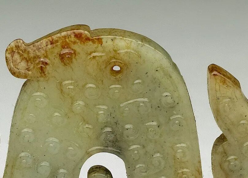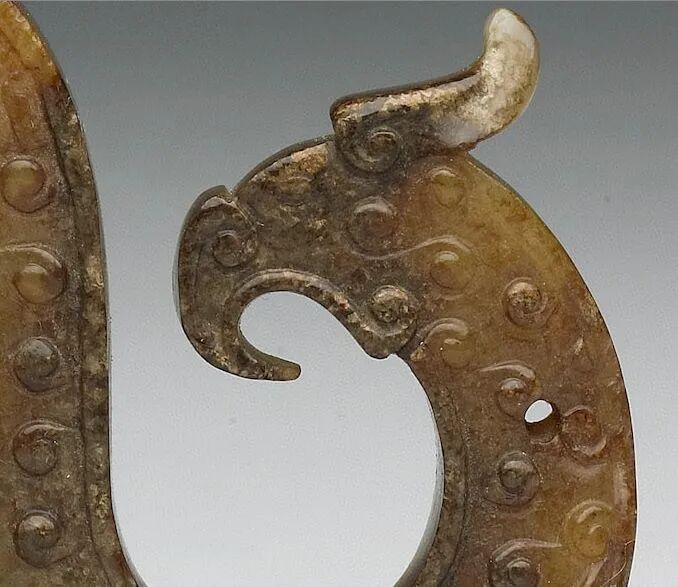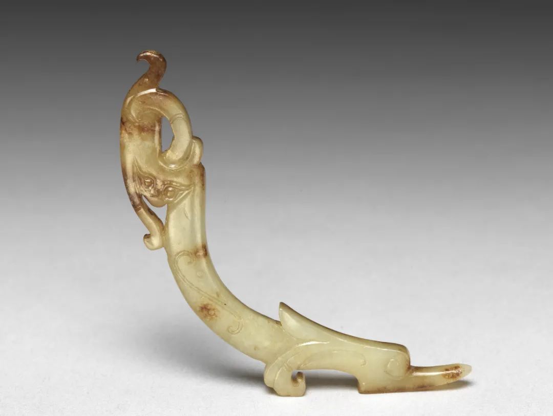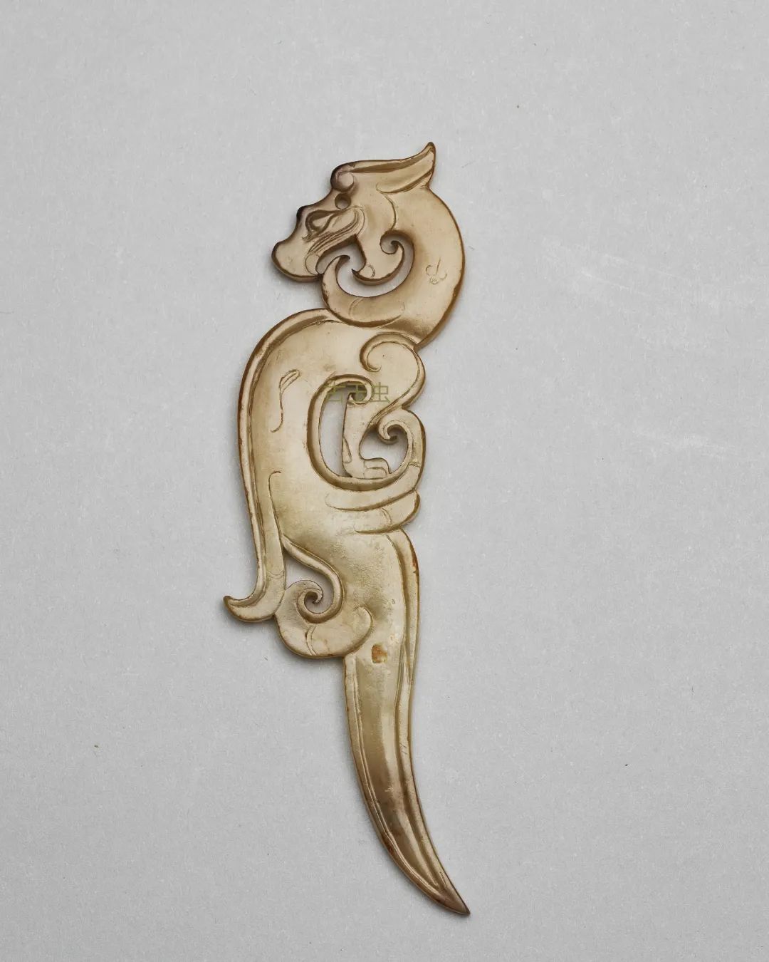 青黄色玉,带赭色、白色斑。鸟首龙身,身躯转折呈” W ” 形。长喙向下弯,头顶一束长羽,周身布满榖纹,中间、颈部、尾端各钻一孔,共三孔,用来穿绳佩戴。