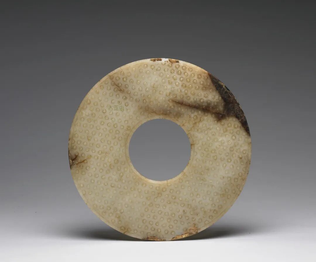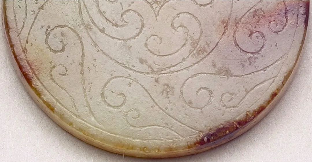 青玉泛黄,有赭斑,表面多处白沁。尚有玻璃光,琢作S 形龙,谷纹排列规整。上缘刻一「百」字。