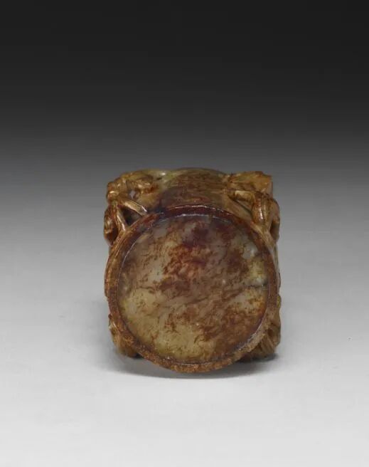 青玉质,多赭黄斑。全器圆筒状,器底是另嵌的圆玉片。全器以高浮雕技法镂刻有两只双身朱雀,其间穿插五只圆螭。朱雀勾喙尖嘴、双翅上扬,双足下方有螭。朱雀後方另有两只螭龙。