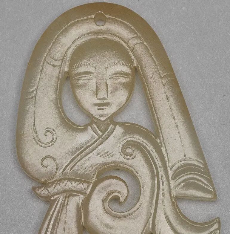 此件玉舞人青白色泽,作工精细,於舞人头顶上方以及裙摆下缘各穿一小孔,便於佩带。类似的考古出土物多见於西汉的贵族墓中。