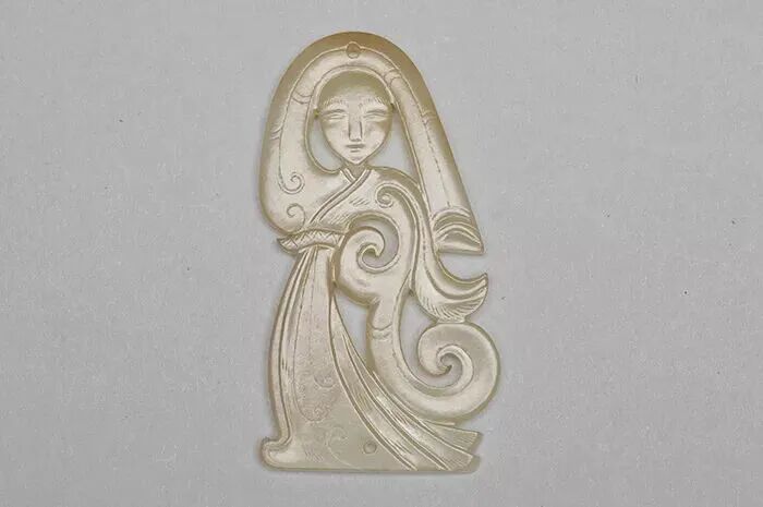 玉舞人是汉代流行的组玉佩中重要的佩饰器,此时期制作的舞人舞姿颇有定式,一般都是着长袖衣,左或右袖高扬过头,另一袖下垂摆动成翻卷状,长裙曳地,细腰束带。