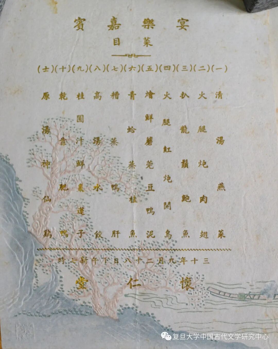 龚心钊对纸张的爱好几乎到了痴迷的程度,凡有旧纸必加蓄储,哪怕是边角小料也不废弃,此册《九成宫》第二页就附空白题签纸一条,极小、长条,就连毛口也未舍得裁切,1938年冬龚心钊在此张题签纸背面另行黏纸题识云:“晋朝茧纸,此纸拭拂而丝不起毛,浸渍而色不涣退,米南宫《宝章待访录》云:‘《右军笔阵图》纸紧薄如金叶,索索有声’,似此质色与声,恰与相合,必非晋以后人所能为也。”此纸坚韧有弹性,表面毛涩,映日透光,中有团团丝绵絮状物,颜色如今日之牛皮纸,且不论此纸年代是否够得上“晋朝”,但从中足见龚氏对旧纸的偏爱。然龚氏对纸张的使用又到了极其吝啬的地步,凡龚氏自用纸张,例如碑帖题跋,所书之纸多为零星小块,极少见有大张。上海图书馆所藏《绍兴米帖宋拓残本》其后民国辛巳(1944)龚氏题跋就书于一张菜单背面。纸张虽然节俭了,然用餐绝不省钱,翻看菜单,饭店超一流,菜品让人垂涎,此张菜单已成珍贵的民国餐饮业档案资料。