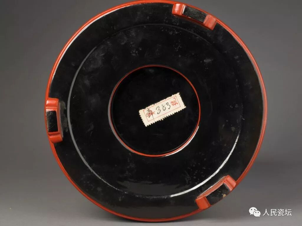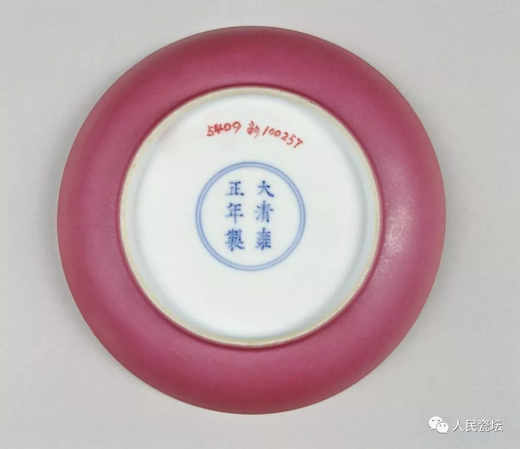 盘敞口,弧壁,圈足。盘内及足内均施白釉,外壁施胭脂红釉。外底署青花楷书“大清雍正年制”双行六字款,外围青花双圈。