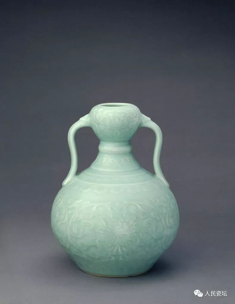 粉青釉凸花如意耳蒜头瓶,清雍正,高22.9cm,口径4.2cm,足径9.9cm。