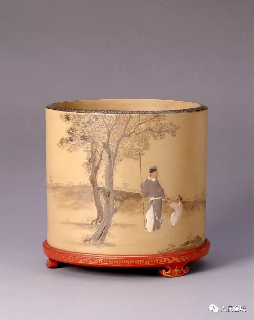 宜兴窑紫砂描金堆绘打枣图大笔筒,清雍正,高16.5cm,口径19cm,底径18.5cm。