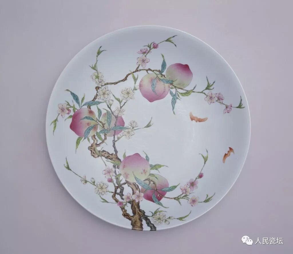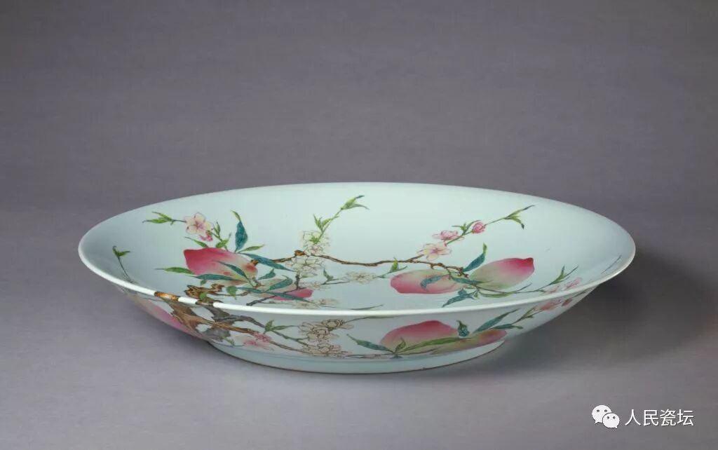 此盘形体硕大,造型端庄,纹饰主题寓意“洪福齐天”、“福寿双全”。这种从器内延伸至器外的画面俗称“过枝花”。清末寂园叟撰《陶雅》曰:“庚子后,所出五彩过枝之盘碗甚多,有桃实八枚缀于枝上者,索价亦甚巨。过枝云者,自此面以达于彼面。枝干相连,花叶相属之谓,皆雍正官窑也。”此种画法起源于清康熙时期,一直影响及道光时期,亦见有“过墙龙”、“过墙凤”等。晚清以后这种画法不多见。