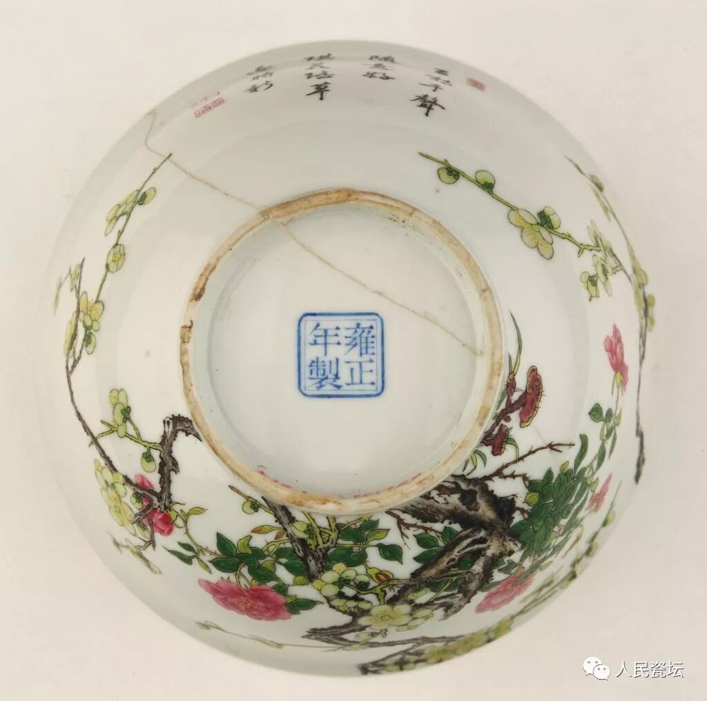 碗撇口,弧壁,圈足。内施白釉。外壁以珐琅彩描绘梅花两株,枝干苍老虬劲,设色娇艳。树下牡丹花朵怒放。一侧墨彩题“百啭千声随意好,琪花琼草逐时新”七言诗句。引首钤闲章“先春”,末尾钤闲章“寿古”、“香清”。圈足内施白釉。外底署蓝料彩楷书“雍正年制”双行四字款,外围蓝料彩双方栏。
