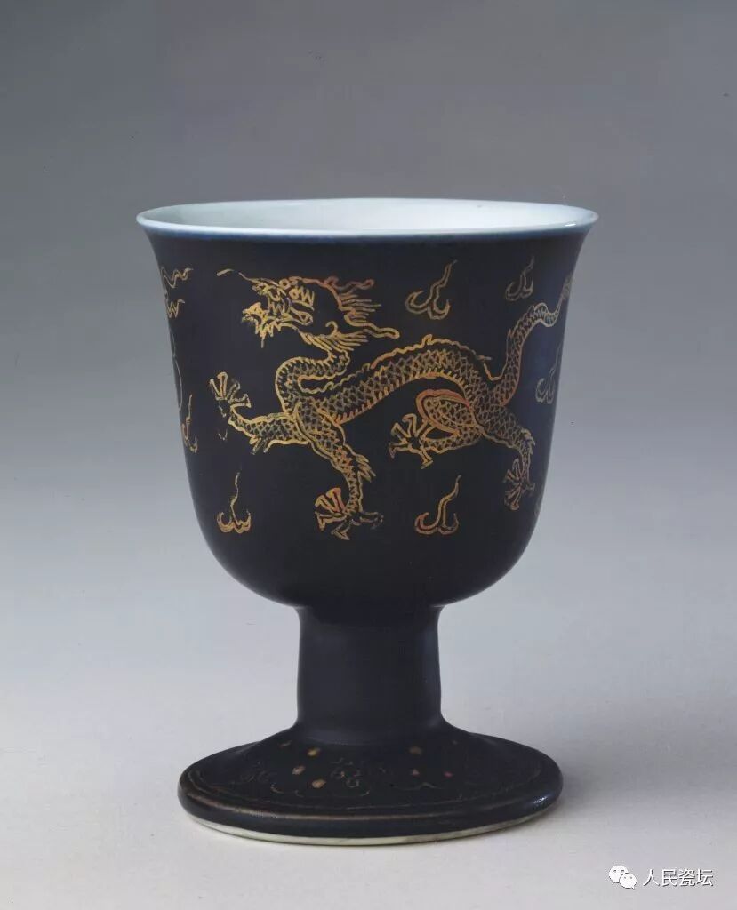 黑釉描金云龙纹高足杯,清雍正, 高9cm,口径7cm,足径5.9cm。清宫旧藏。