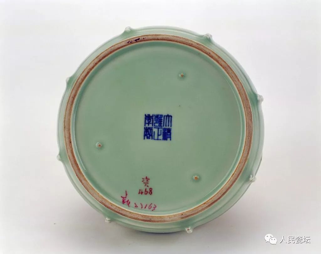 清代青釉器的烧造肇始于康熙,盛于雍正、乾隆时期,根据釉色深浅的不同又分为豆青、冬青、粉青3种釉色。其中以粉青釉色最为雅致美观。该器工艺复杂,技艺精湛,装饰在器身的8条曲线,给原本单一的粉青釉色增添了一种节奏与韵律的美感。小瓶瓶口虽有残缺,但不失为一件精美之作,极具艺术和观赏价值。