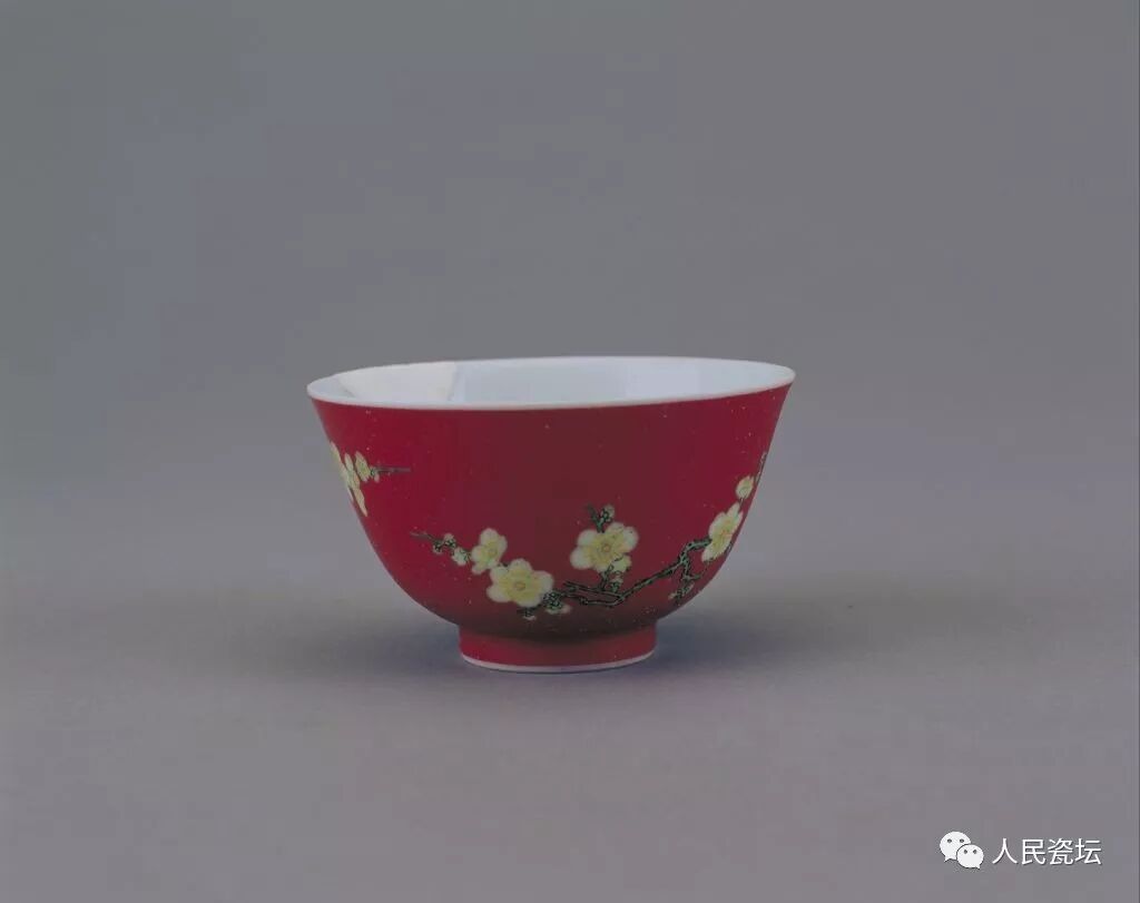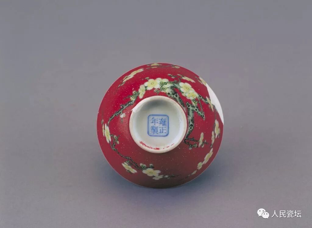 故宫藏《乾清宫珐琅、玻璃、宜兴胎陈设档》中罗列了从康熙至乾隆朝宫廷收藏的珐琅器共408件,其中雍正朝珐琅彩器有201件,档案记载珐琅彩器中绘有红地白梅花图案的器物有宫碗、四寸碟、三寸碟、盅4个品种,共14件,由此可见,雍正帝喜爱此图案。珐琅彩器绝大部分收藏于台北故宫,北京故宫只有一小部分收藏。现台北故宫中可见到档案中记载的红地白梅花图案的碗、碟,未曾见小盅。故宫资料中发现的这对小盅,与档案第67条记载的“瓷胎画珐琅白梅花红地盅”品名、款识完全一致,小盅虽有残破,但却解决了二百多年来悬而未决的问题,意义重大。