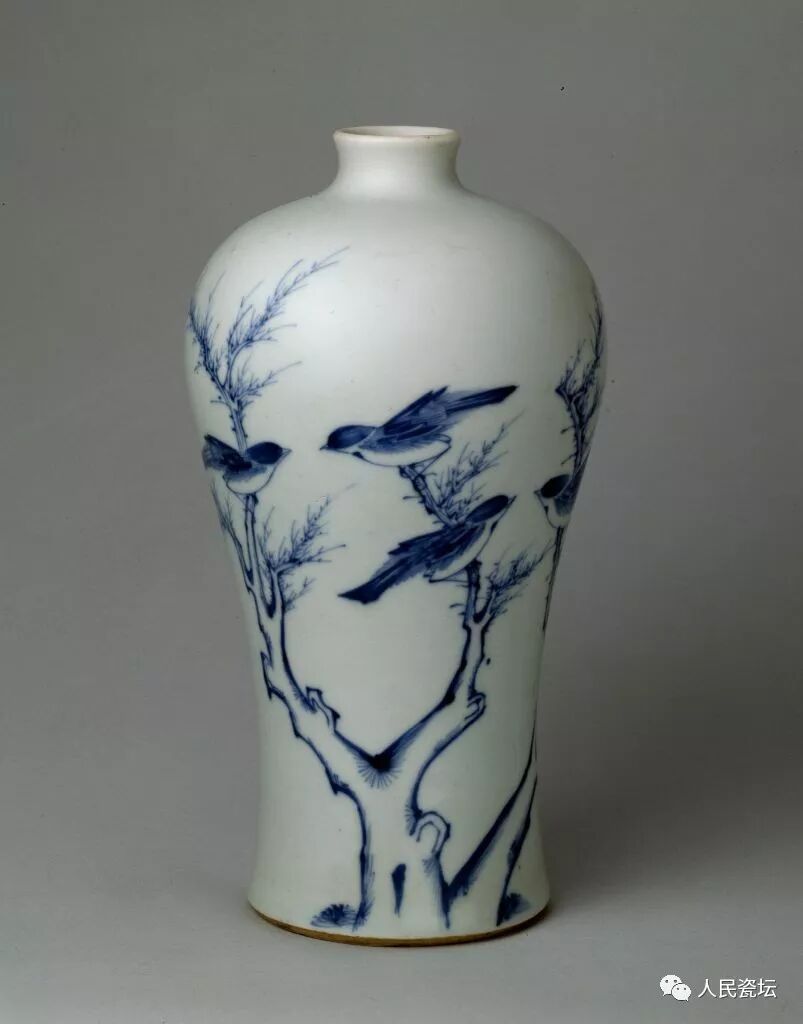梅瓶小口,短颈,丰肩,腹以下内敛,近底处外撇,玉璧形底。内施白釉。外壁青花装饰,通景绘枯树栖鸟图,栖落在冬日枯树上的山雀两两相对,野趣十足,别有情致。底心施白釉,署青花楷书“雍正年制” 双行四字款。