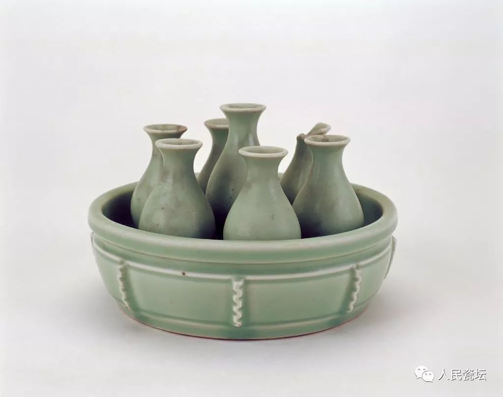粉青釉七孔花插,清雍正,高11.5cm,小瓶口径2.5cm,足径14.8cm。