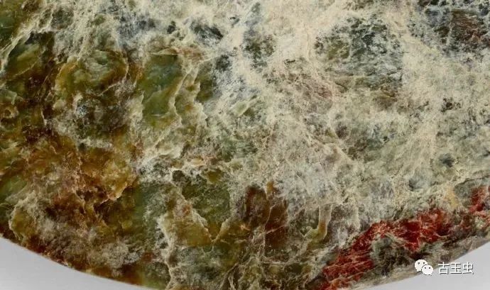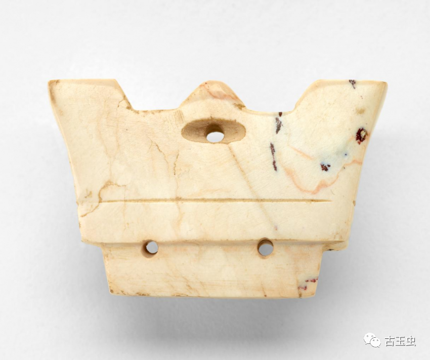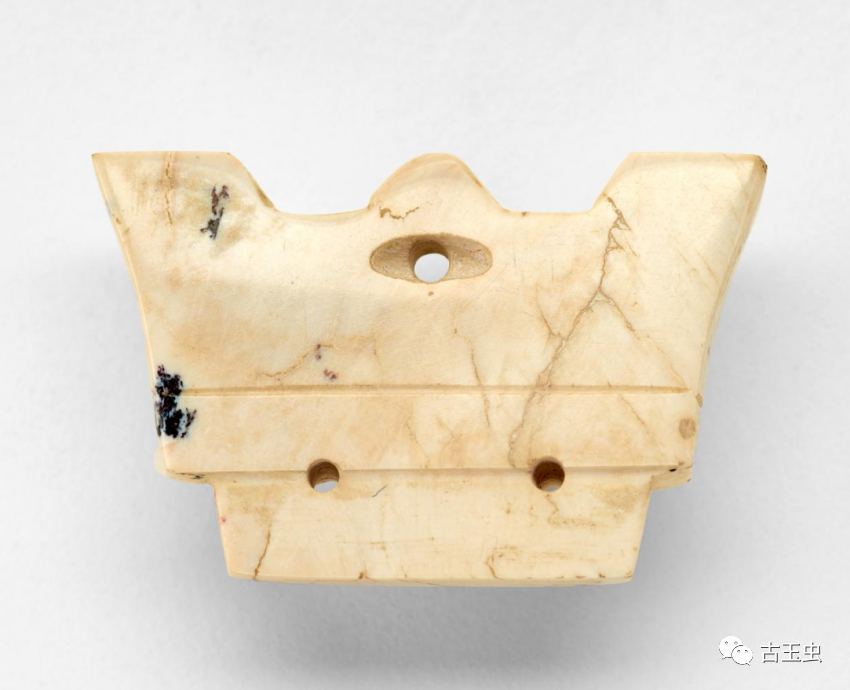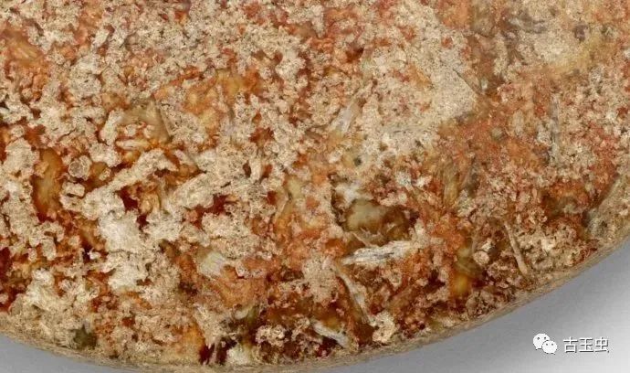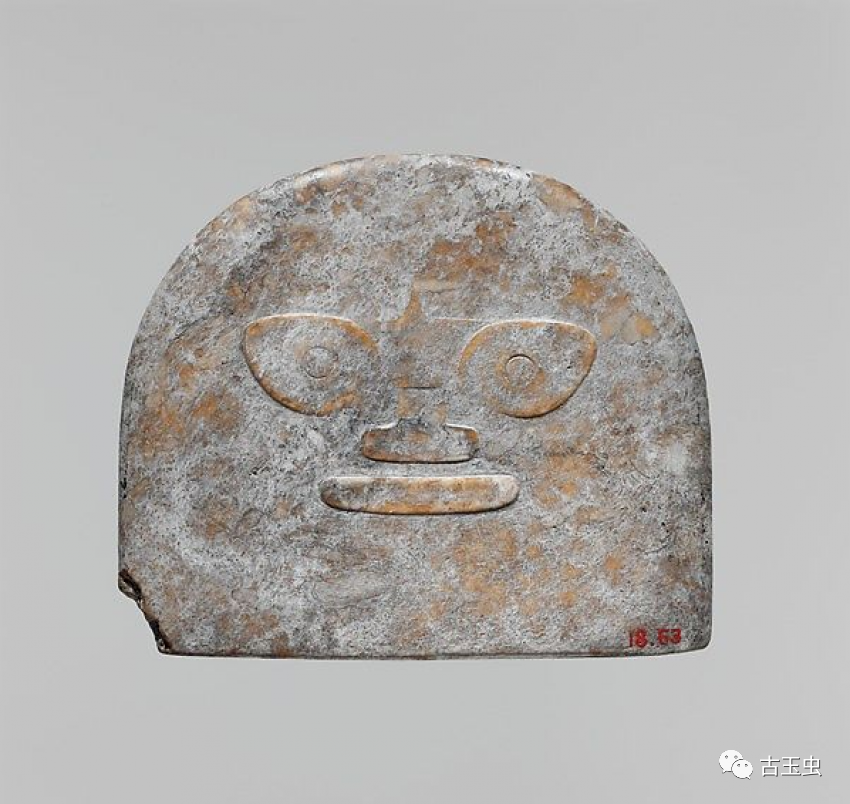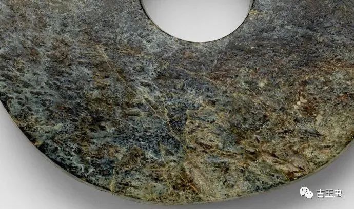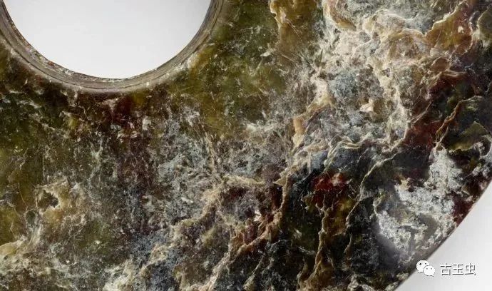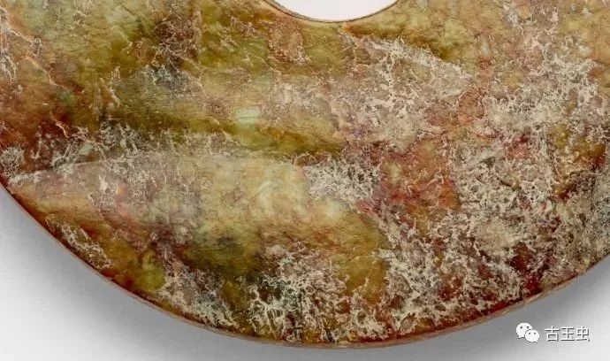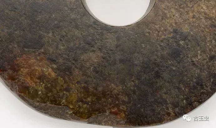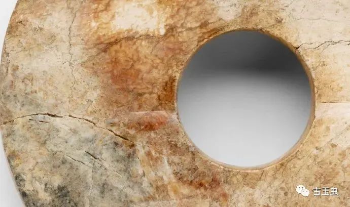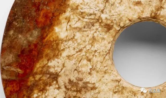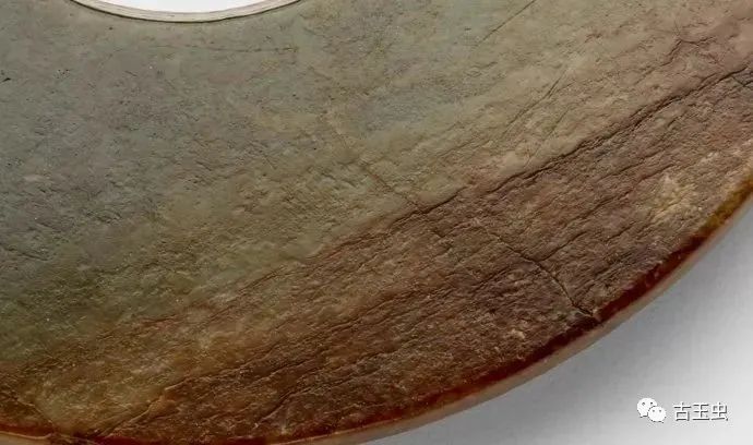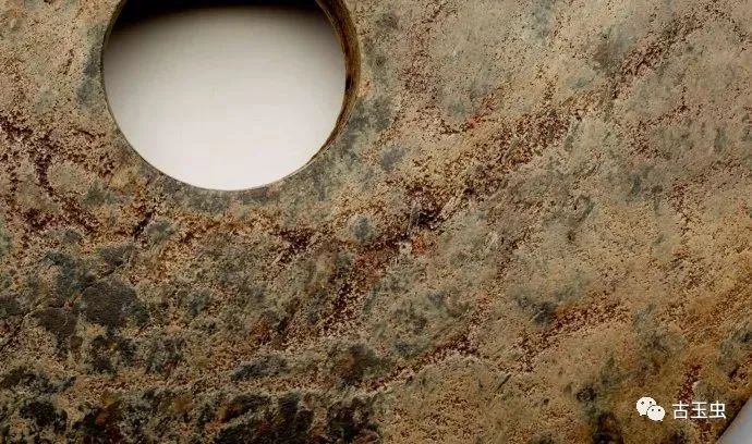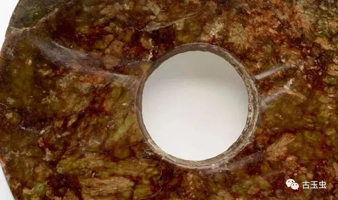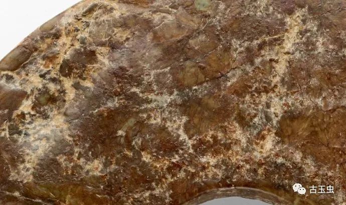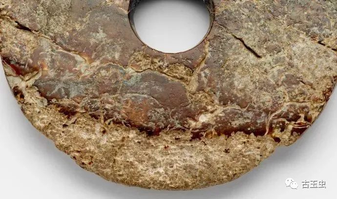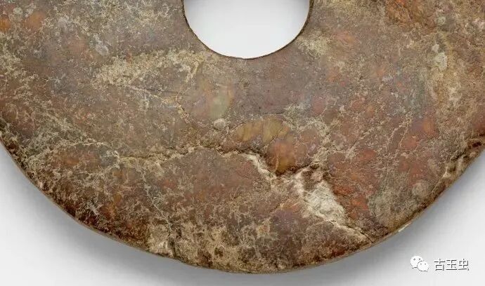 特征:从两边钻孔,留下明显的中间脊; 富有斑驳的褐色,玉表分解过度,边缘附近两侧完全分解; 比例不规则; 表面粗糙,有裂缝和分解孔洞。