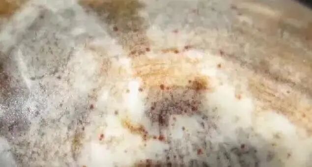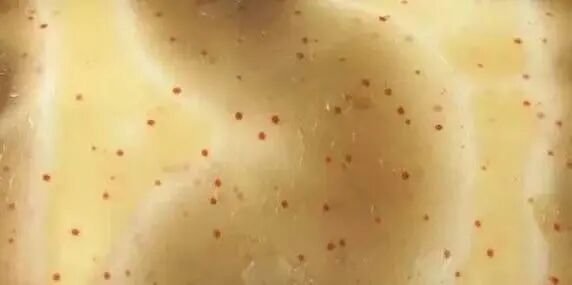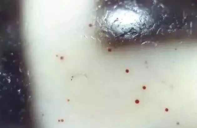 所谓天珠的朱砂点,也就是天然矿物中所含铁元素物质,经过长时间接触大气中所含物质后形成氧化铁,经由矿物本体之毛细孔,由内部往外延伸出来,其颜色有些是淡咖啡色,有些是深红色,如下图