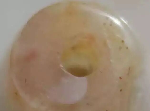 下图为一颗清代的玛瑙珠,可以看到珠体内部有朱砂正在渗出,有朱砂已经渗出表面。