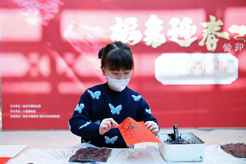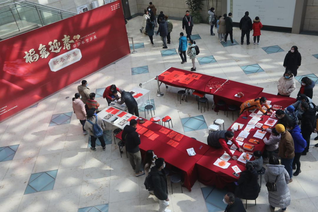 为了提高游客们的体验感,六朝博物馆还在2023年春节期间,结合新春兔年生肖展,开展“福兔迎春”兔年展教主题活动——新春市集,活动以市集的形式,集合多种非遗手工体验,让游客们在观展之余,还能亲手体验下传统手工艺术的魅力和乐趣。活动形式丰富多样,有猜灯谜小游戏、兔毫盏茶艺绘画、兔子花灯制作、卯兔拓印、唇脂制作、手工香皂、福兔对联等手工体验活动。在游人如织的博物馆一楼大厅,整个市集以喜气洋洋的春节红为底色,大朋友和小朋友们在传统手工艺人的带领下,扎花灯,做唇脂,猜灯谜。最受欢迎的要数版画制作和兔子花灯的制作了,挑选自己喜欢的图案,刷油墨,盖画纸,刷图案,展成品,拿到自己亲手制作的门神,贴在自己家的大门上,别提多有意义了;小兔子花灯的制作则给了孩子们珍贵的亲子互动体验,提着小花灯逛展览,也别有一番趣味。
