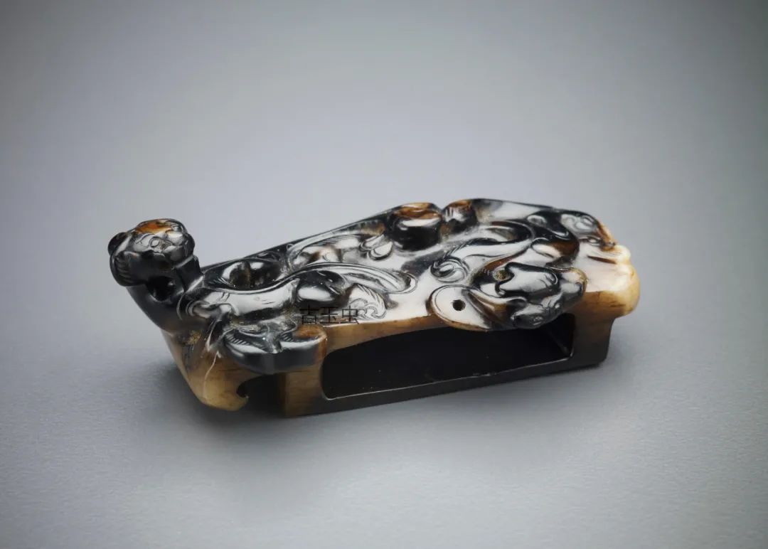 古玉中水银沁的形态一般有块状、斑状、点状和丝状4种。块状是指玉器全体或接近全体呈黑色,斑状则指玉器部分成黑色,点状的俗称“芝麻点”,丝状的俗称“牛毛纹”。根据其各自的形态和呈色表现,水银沁被后人赋予形象而又生动的名词:陈墨黑、纯漆古、金貂须、黑漆古等。