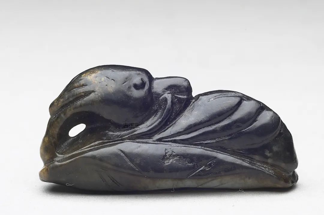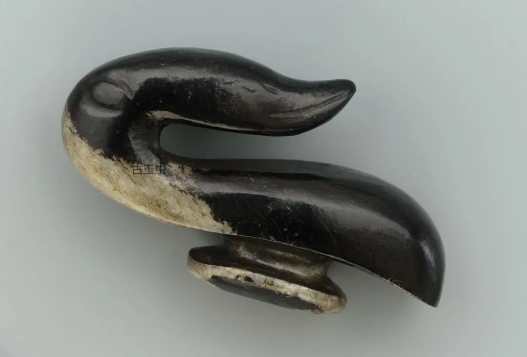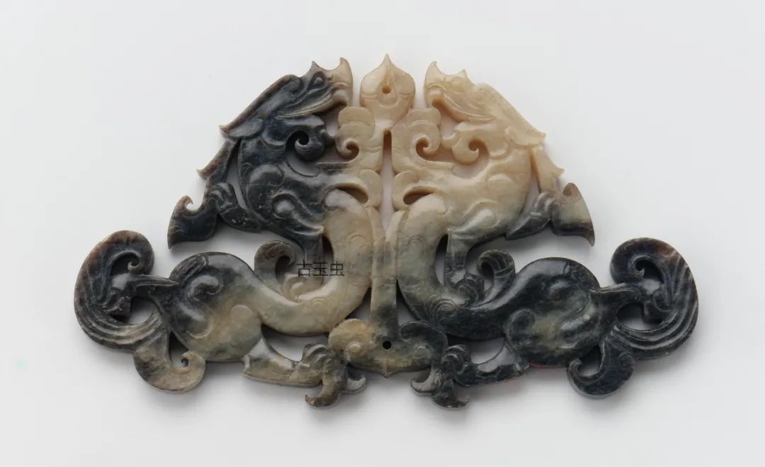 关于水银沁的形态及真伪,古人的描述为“水银沁干结成块,其发光处点多圆形,白如珠,闪光夺目;或含绿圆点而透明,莹莹如玉珠”;“黑漆古而含绿……见土咬寸余,如虫蛀”。这两句话十分形象地告诉我们,黑漆古、纯黑漆总体上呈深沉的黑色,但在局部有颜色变化。“白如珠”“或含绿圆点”,均“发光”或“透明”,并有“土咬寸余,如虫蛀”的沁门,说明玉器在埋藏中受到外部环境的影响,使玉材内部能致黑的元素起了变化。